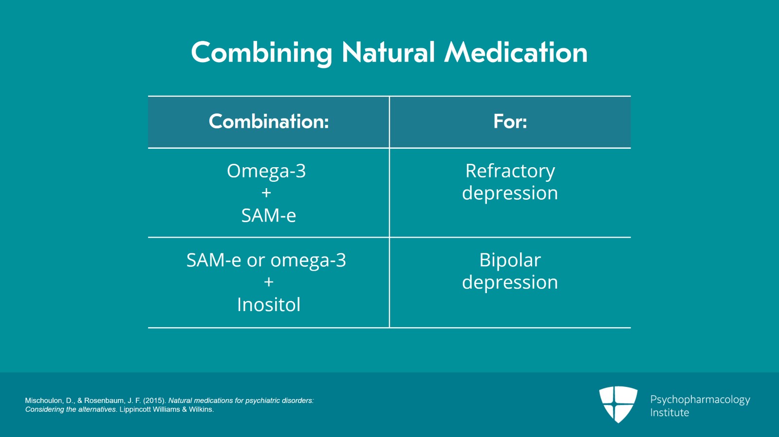 What else? Omega-3 and SAM-e could be combined together for refractory depression. And SAM-e or omega-3 could be combined with inositol for bipolar depression. But remember in cases of bipolar illness when you're looking to prevent mania, probably the safest strategy is to use a registered mood stabilizer. But these are approaches that you can take in certain carefully selected patients.