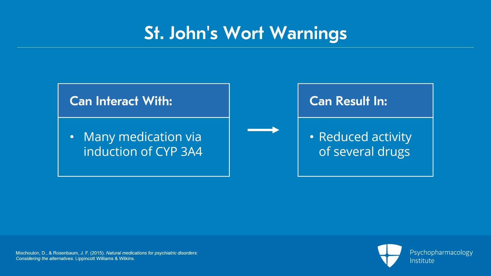 Having mentioned St. John's wort, I do want to issue a warning about it. Combining St. John's wort with other drugs can be tricky because it can interact with many other medications primarily via induction of cytochrome P3A4. This can result in reduced activity of several drugs: Warfarin, cyclosporine, birth control pills, some of the anti-HIV drugs, zolpidem and olanzapine among others.