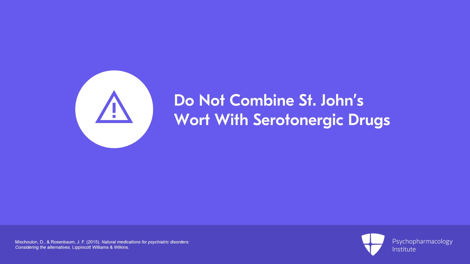 Another important caveat about St. John's wort, it should not be combined with serotonergic drugs such as the SSRIs because St. John's wort contains some mild monoamine oxidase inhibitor activity. The interactions with serotonergic drugs have been reported to cause serotonin syndrome in some patients.