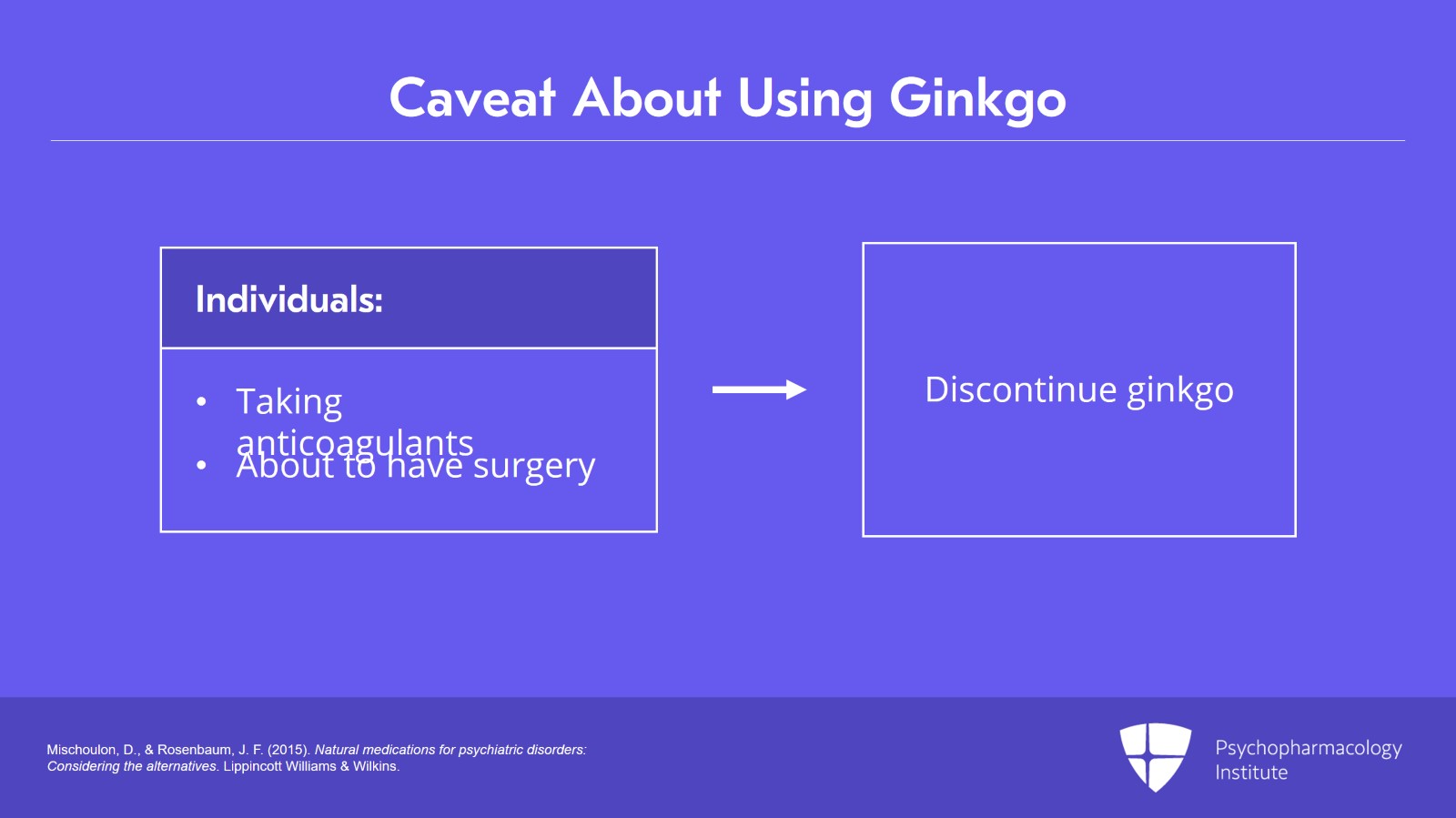 The main caveat about using ginkgo is that certain individuals taking anticoagulants or who are about to have surgery should discontinue ginkgo because ginkgo inhibits platelet activating factor and may increase the risk of bleeding.
