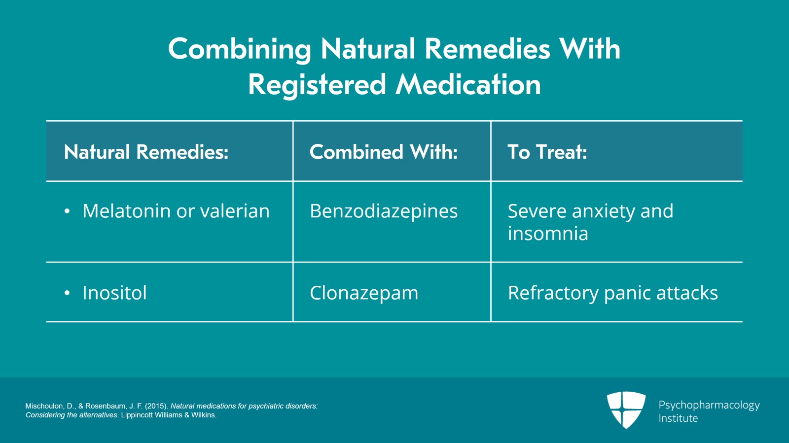 Other strategies include combining melatonin or valerian with benzodiazepines for cases of more severe anxiety and insomnia. Other examples include combining inositol with clonazepam for refractory panic attacks.