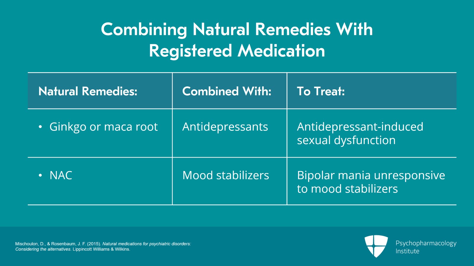 Ginkgo or maca root can be combined with standard antidepressants, in cases of antidepressant-induced sexual dysfunction. NAC could be combined with standard mood stabilizers in cases of bipolar mania that does not respond to mood stabilizers alone.