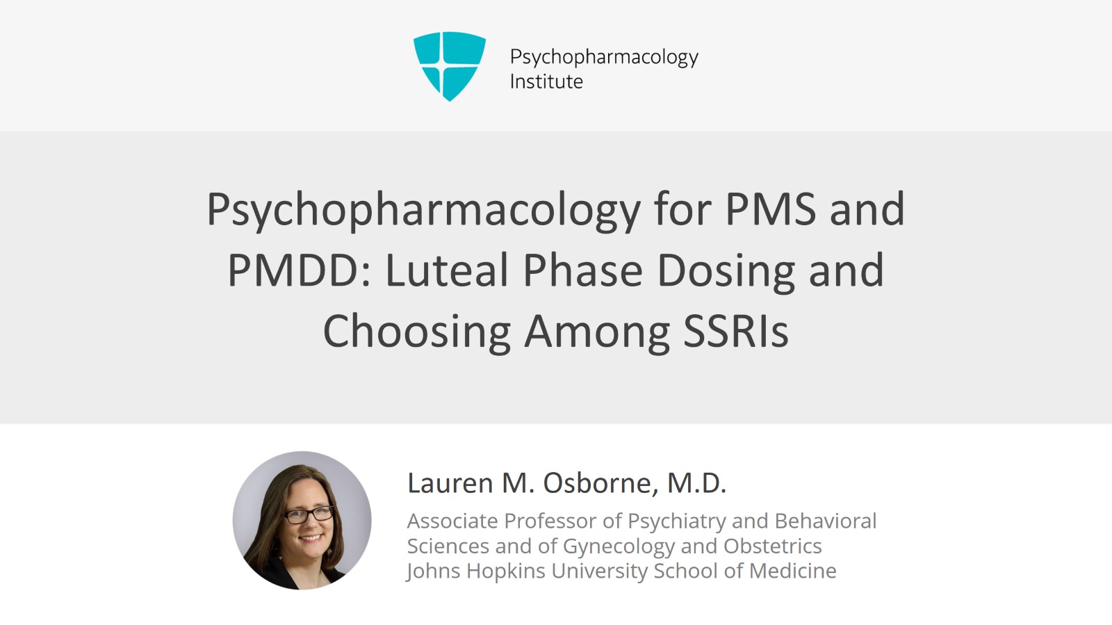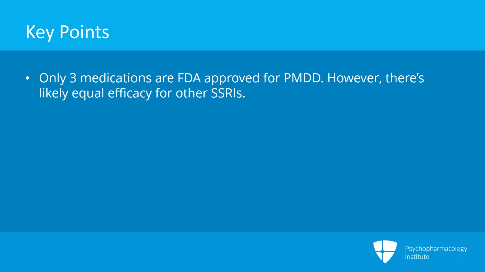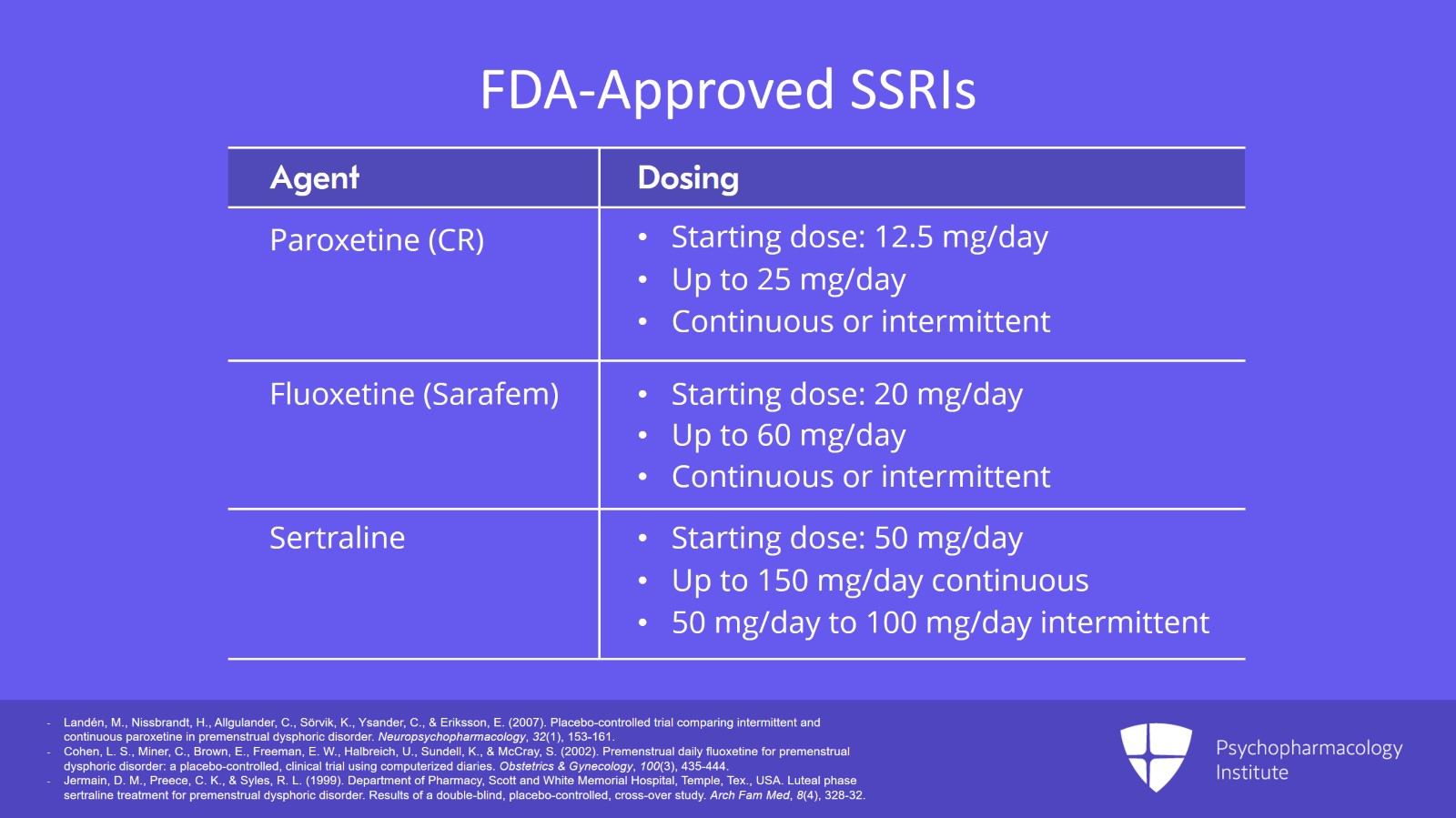 So we know that there are a number of SSRIs that are FDA approved for PMDD but other SSRIs are likely equally effective. They just haven't been studied enough to be FDA approved. Most of the studies show that there's actually no difference in efficacy by method of dosing whether you dose them luteal phase only, symptom onset only or continuous. The three SSRIs that have been FDA approved are controlled release paroxetine, fluoxetine, and sertraline. And what we also know about SSRIs in PMDD is that they can be used at much lower doses than we use them for major depressive disorder. So for the controlled release paroxetine, the usual starting dose for PMDD is 12.5 mg and using it at 12.5 to 25 mg a day either continuous or intermittent dosing. For fluoxetine, usual starting dose will be 20 mg and use again 20 to 60 mg for either continuous or intermittent dosing. And for sertraline, that usual starting dose would be 50 mg and using it 50 to 150 when there is continuous dosing and 50 to 100 for intermittent dosing.