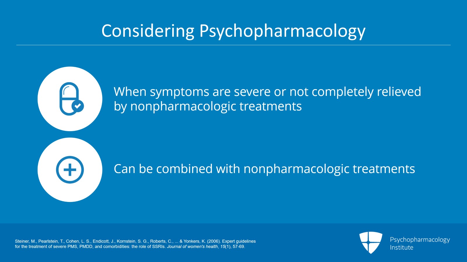- Steiner, M., Pearlstein, T., Cohen, L. S., Endicott, J., Kornstein, S. G., Roberts, C., … & Yonkers, K. (2006). Expert guidelines for the treatment of severe PMS, PMDD, and comorbidities: the role of SSRIs. Journal of women's health, 15(1), 57-69.