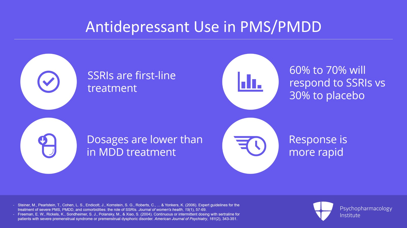 So what do we know about antidepressant treatment? SSRIs are the first-line treatment and there have been at least 40 placebo-controlled, randomized controlled trials of SSRIs for either PMS or PMDD. Of those women with PMS or PMDD, about 60% to 70% will respond to SSRIs versus about 30% responding to placebo. Effective dosages are lower in PMDD than for MDD and response is more rapid.