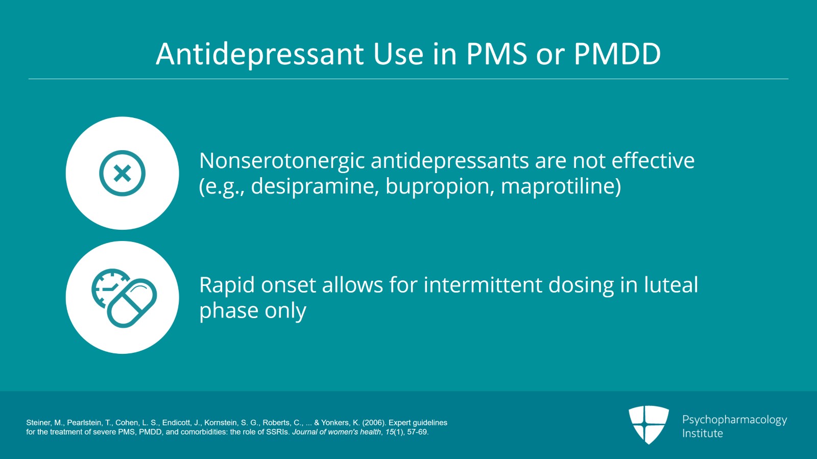 So antidepressants that primarily affect other transmitters other than serotonin are not effective for PMS or PMDD. So, for example, you don't want to use desipramine which is a noradrenergic antidepressant, bupropion which has weak serotonin, it's mostly noradrenergic and dopaminergic, or maprotiline, for example, which is noradrenergic. The unique feature of SSRI response in PMDD is that it's rapid onset such that intermittent dosing and SSRI taken only in the luteal phase is effective. Many women find this very comforting. They don't like the idea of being on a drug all the time. And knowing that luteal phase dosing is possible makes psychopharmacologic treatment more palatable for some patients.
