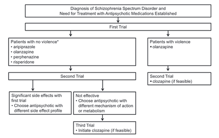 The algorithm begins after you’ve made a working diagnosis of a schizophrenia spectrum disorder. The first and most critical decision point is whether violence is present, which leads to two different pathways: