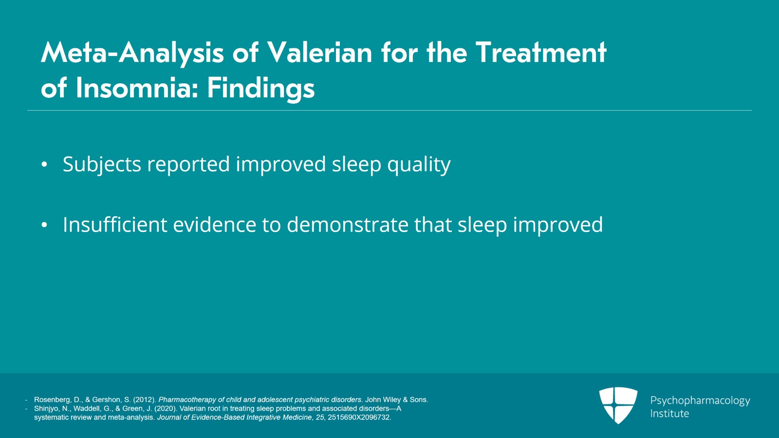 A recent meta-analysis of 18 randomized controlled trials of valerian for the treatment of insomnia found that subjects generally reported improved sleep quality.