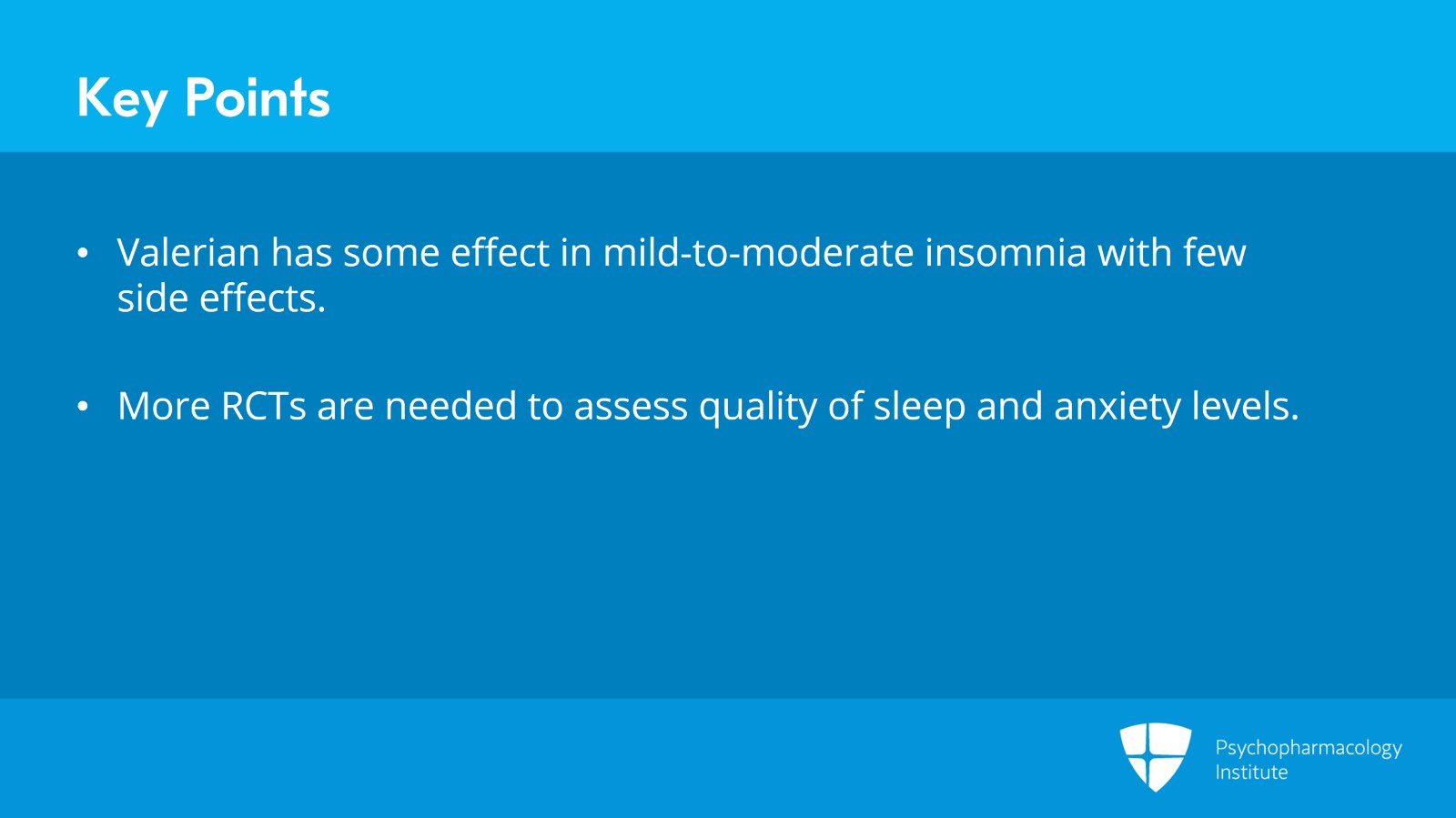 More randomized controlled trials are needed with larger samples, standardization of measures used to assess quality of sleep and levels of anxiety and standardization of dose, type of preparation of valerian used and the time for its use.