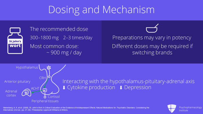 The recommended dose of St. John’s wort runs between 300 and 1800 mg a day. Typically, it’s dosed on a two- or three-times-a-day basis and the most common dose used is about 900 mg a day. The practitioner and the consumer should keep in mind that different preparations of St. John’s wort may vary with regard to potency depending on how they are manufactured. So different doses may be required if switching from one brand to another. St. John’s wort is thought to work by interacting with the hypothalamus-pituitary-adrenal axis with an effect of reducing cytokine production which in turn may dampen depression.