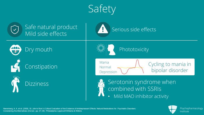 St. John’s wort is thought to be a very safe natural product. Its side effects tend to be mild. Most commonly, we’ll see dry mouth, dizziness, and constipation. However, there are some more serious side effects that may occur, for example, phototoxicity which is extreme sensitivity to sunlight and also cycling to mania in patients with bipolar disorder. Serotonin syndrome has been found to occur when St. John’s wort is combined with SSRIs like fluoxetine or sertraline. This is because St. John’s wort has a very mild monoamine oxidase inhibitor activity.