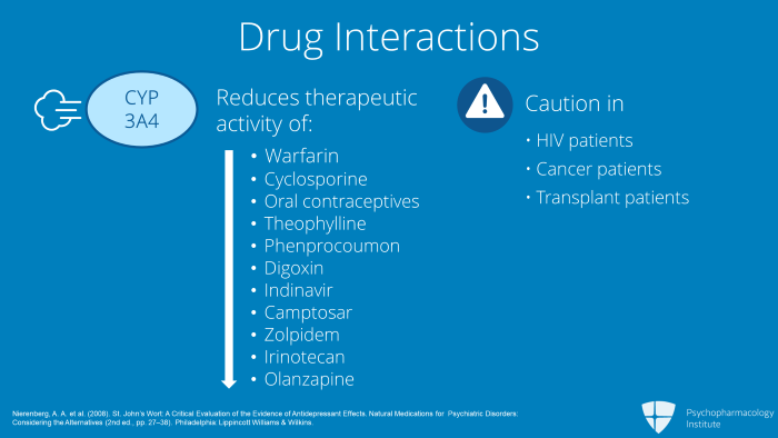 Another concern about St. John’s wort is that it can interact with other drugs. St. John’s wort induces the enzyme cytochrome P3A4 and this increased activity of the enzyme can reduce therapeutic activity of other drugs. Among the drugs that are affected by St. John’s wort include warfarin, cyclosporine, oral contraceptives, theophylline, phenprocoumon, digoxin, indinavir, Camptosar, zolpidem, irinotecan, olanzapine, and maybe others. For this reason, we need to be cautious, for example, in patients with HIV or patients who have cancer or who have undergone transplants because the addition of St. John’s wort could affect the medications that these patients are taking.