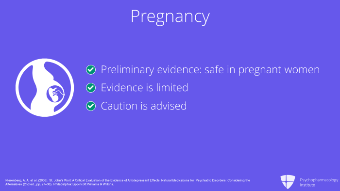 With regard to pregnancy, preliminary evidence suggests that St. John’s wort is safe in pregnant women. However, the evidence is limited and therefore, caution is advised in pregnant women.
