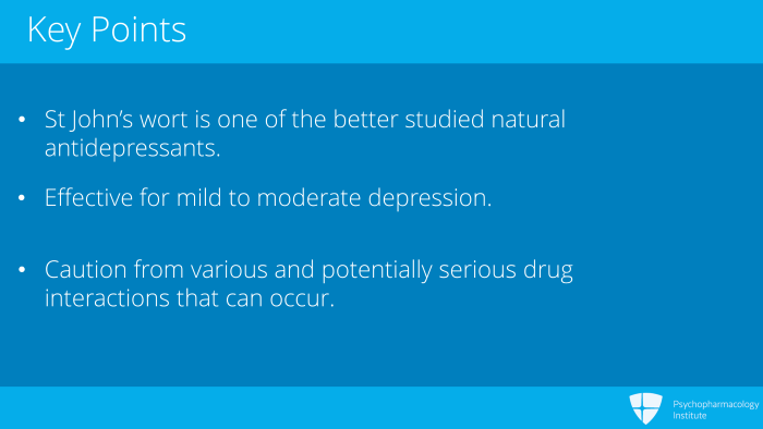Let me summarize a few key points on St. John’s wort. It is one of the better studied natural antidepressants. It appears to be effective for mild to moderate forms of depression but caution should be used with it because there may be various and potentially serious urban drug interactions that can occur.