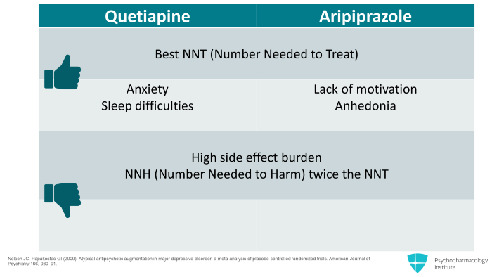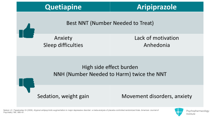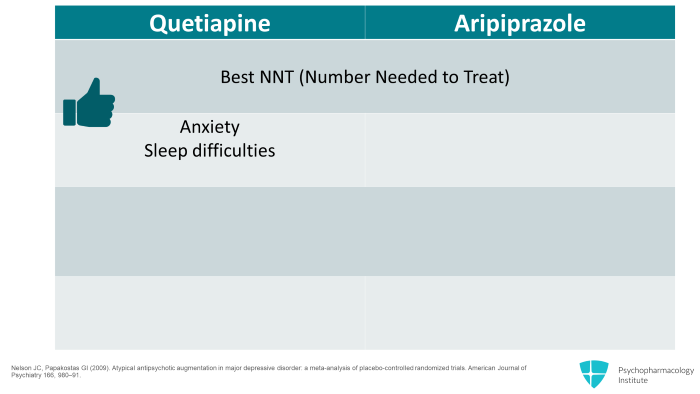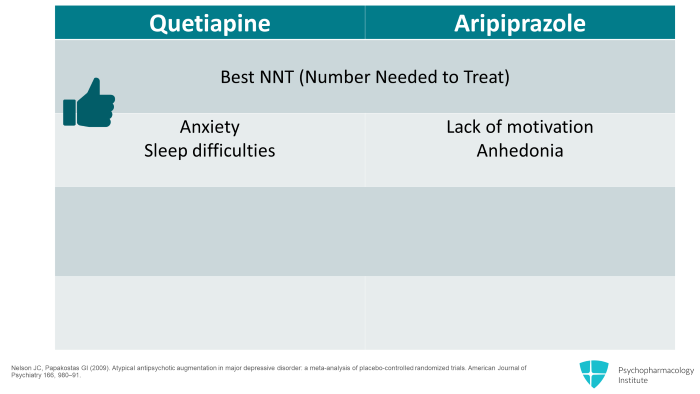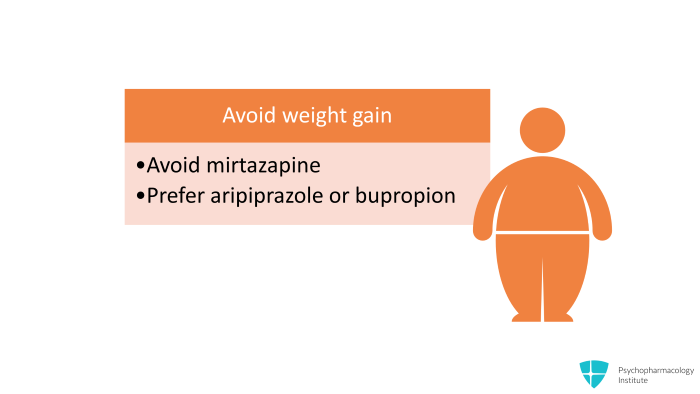 Another thing to add is particularly if you want to avoid weight gain, I would avoid mirtazapine with which that’s a major problem and go for something like aripiprazole or bupropion. Just another thing to mention is that bupropion is not licensed in the treatment of depression in the UK where it’s licensed only for the management of smoking cessation.