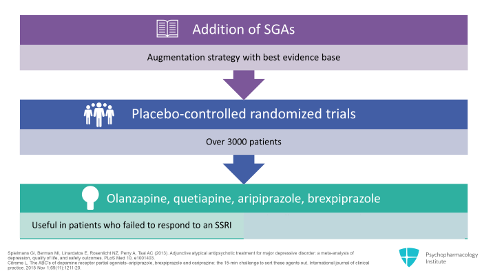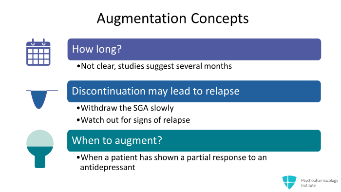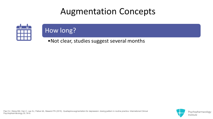 One thing that I’m sometimes asked is how long should patients stay on this augmentation, combination of treatments if they do respond to the addition of an atypical? The answer is that it’s not very clear at the moment. These studies and literature suggest that often the combined treatment needs to be carried on for several months
