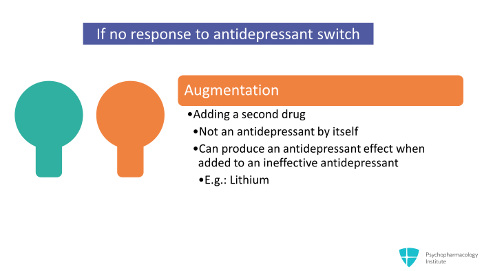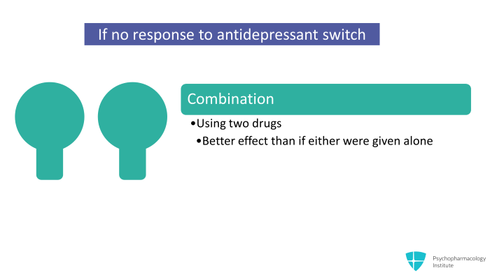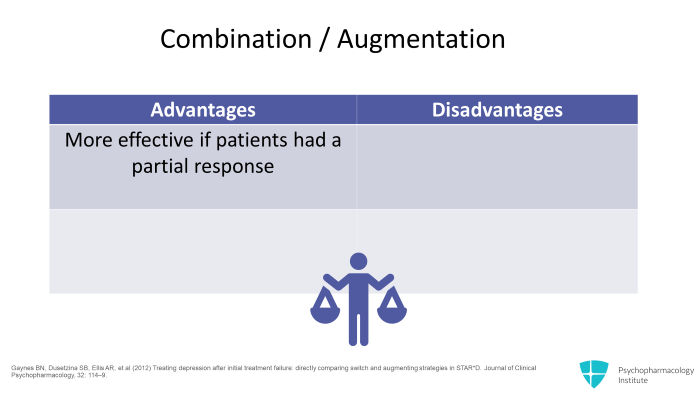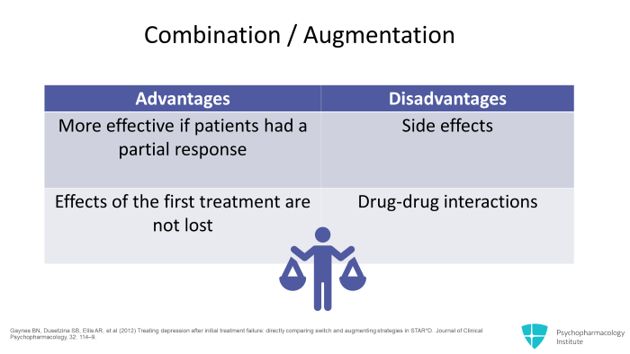So just to summarize the key points there, adding a second drug in either combination or augmentation is slightly more effective and faster acting than a switch in treatment. On the other hand, there’s a greater risk of side effects and drug interaction.