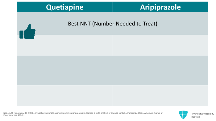 So one is thinking of a dose of about 2.5 to 10 mg of aripiprazole, 50 to 300 mg of quetiapine.
