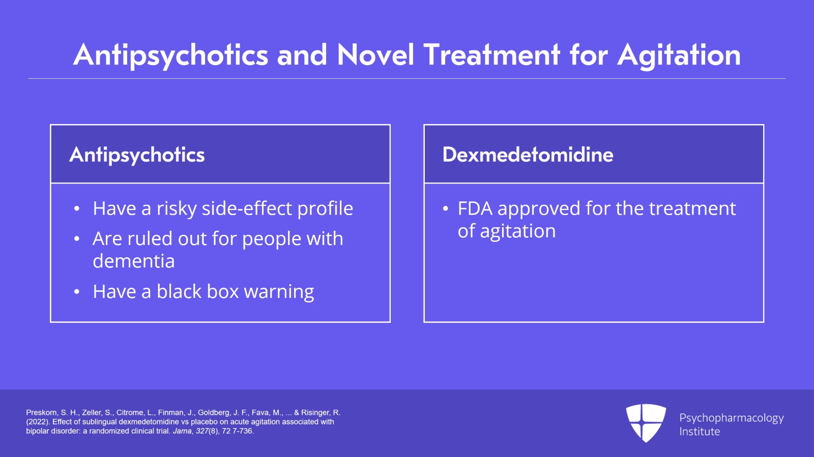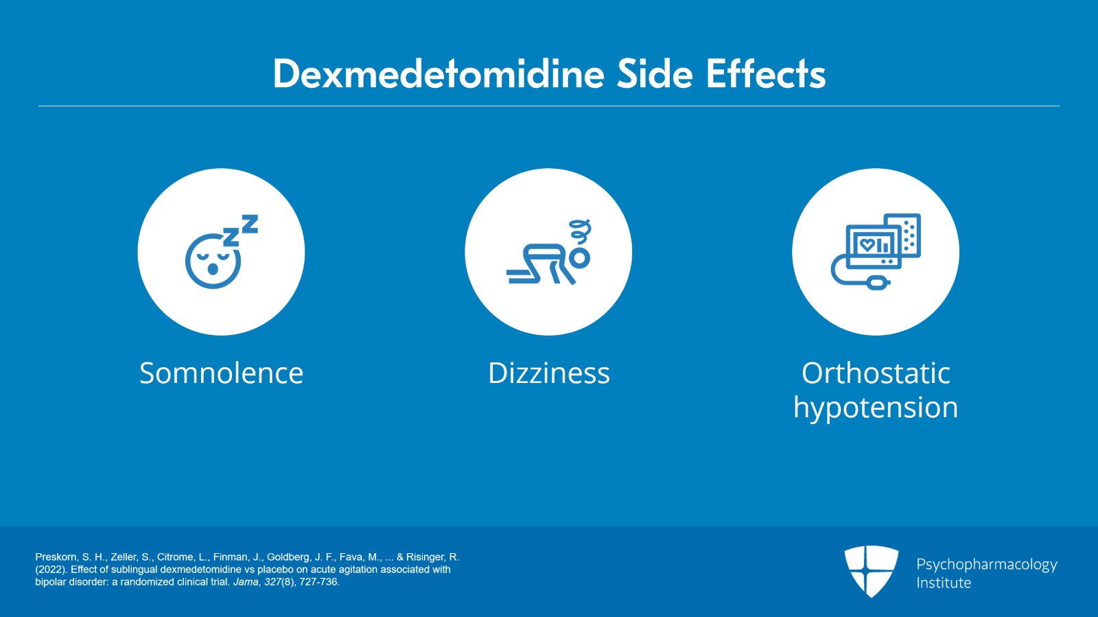 - Preskorn, S. H., Zeller, S., Citrome, L., Finman, J., Goldberg, J. F., Fava, M., … & Risinger, R. (2022). Effect of sublingual dexmedetomidine vs placebo on acute agitation associated with bipolar disorder: A randomized clinical trial. Jama, 327(8), 72 7-736.