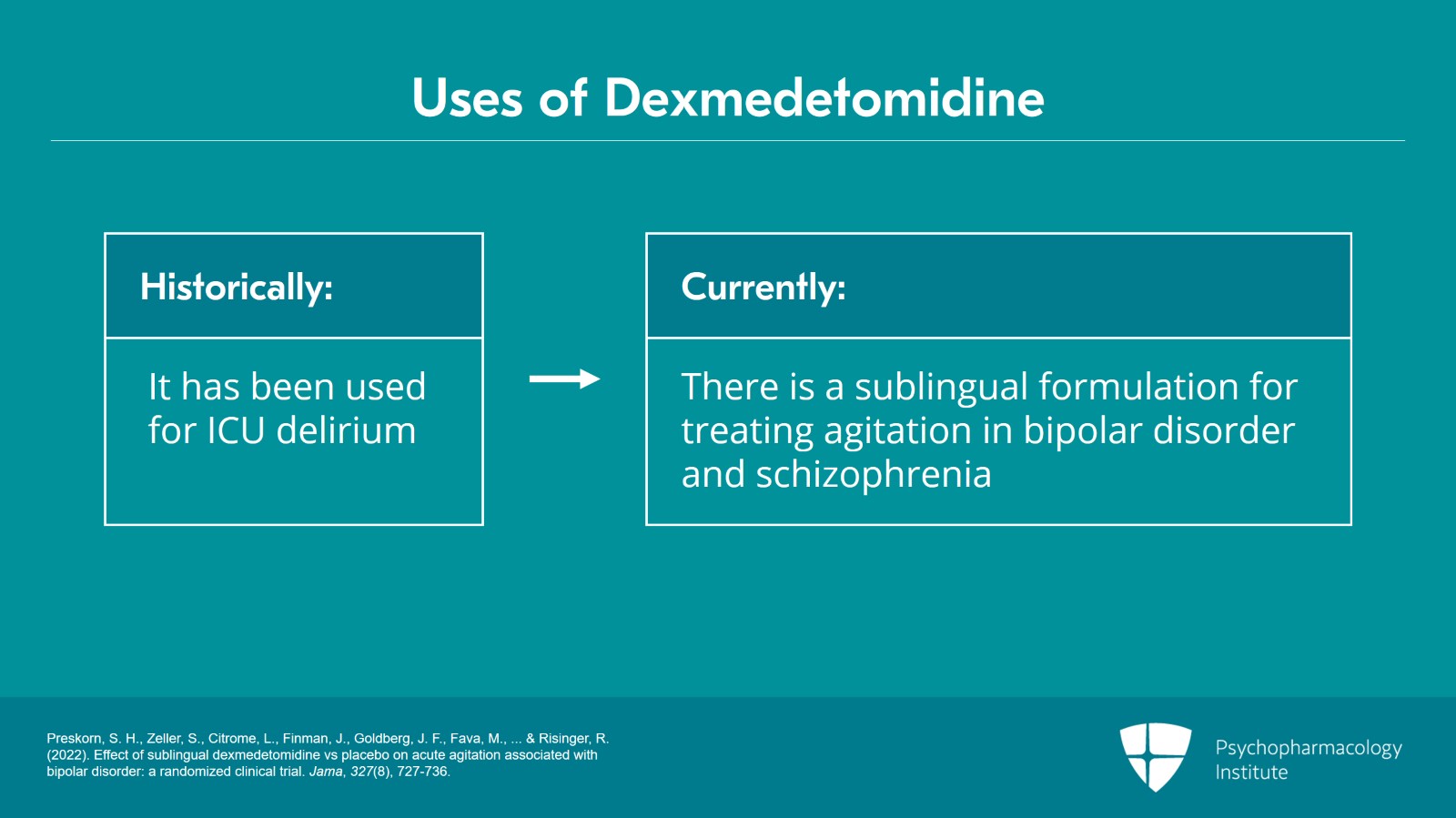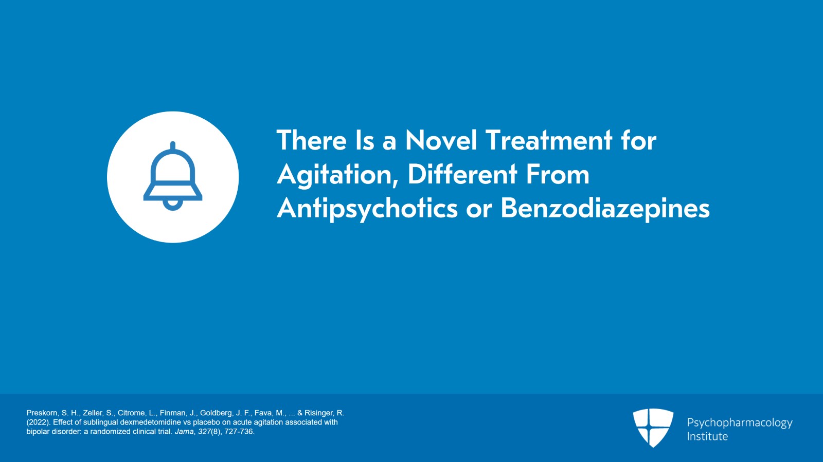 - Preskorn, S. H., Zeller, S., Citrome, L., Finman, J., Goldberg, J. F., Fava, M., … & Risinger, R. (2022). Effect of sublingual dexmedetomidine vs placebo on acute agitation associated with bipolar disorder: A randomized clinical trial. Jama, 327(8), 727-736.