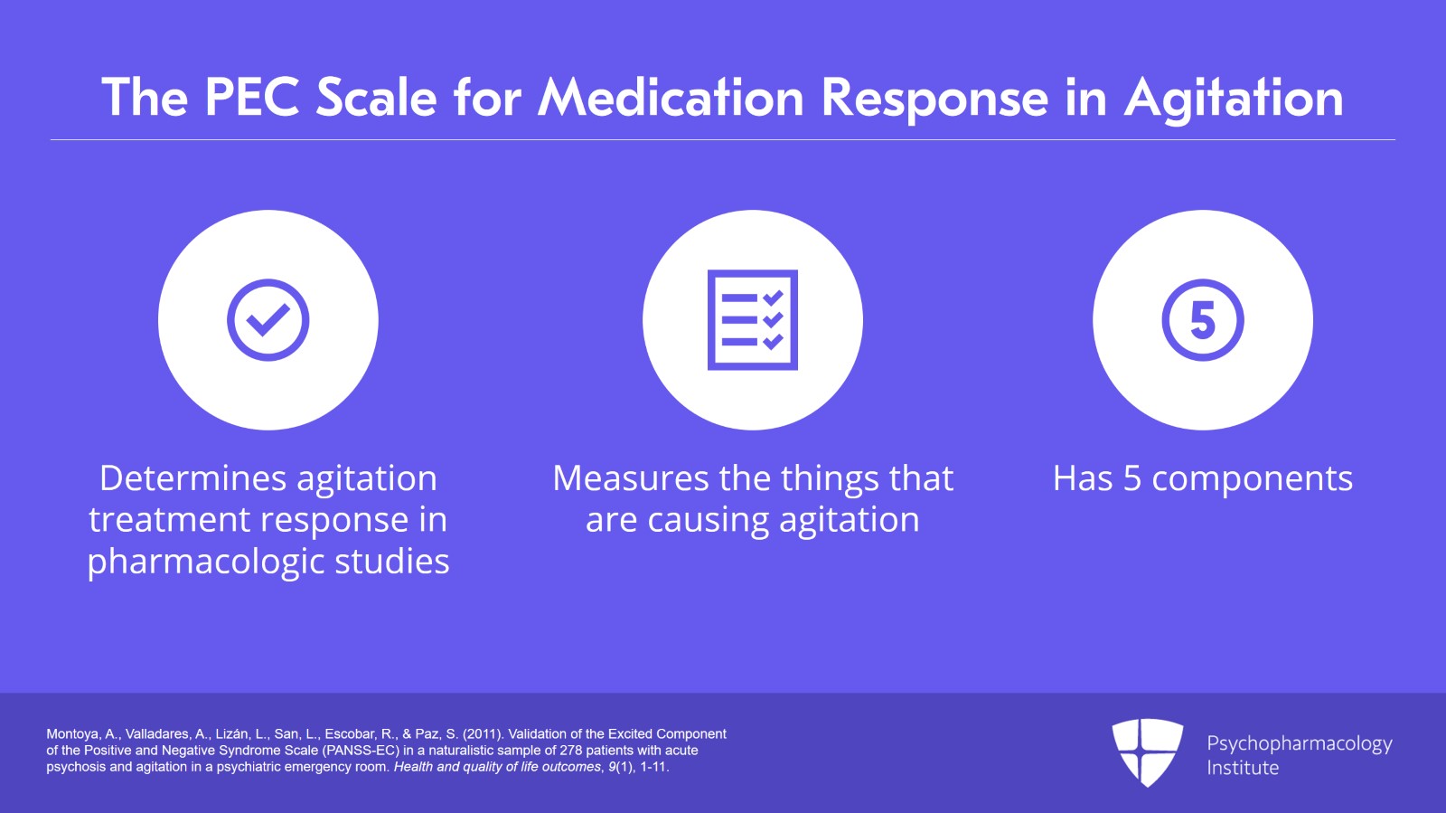 The PEC Scale is what’s used most commonly to determine response to agitation treatment in pharmacologic studies.