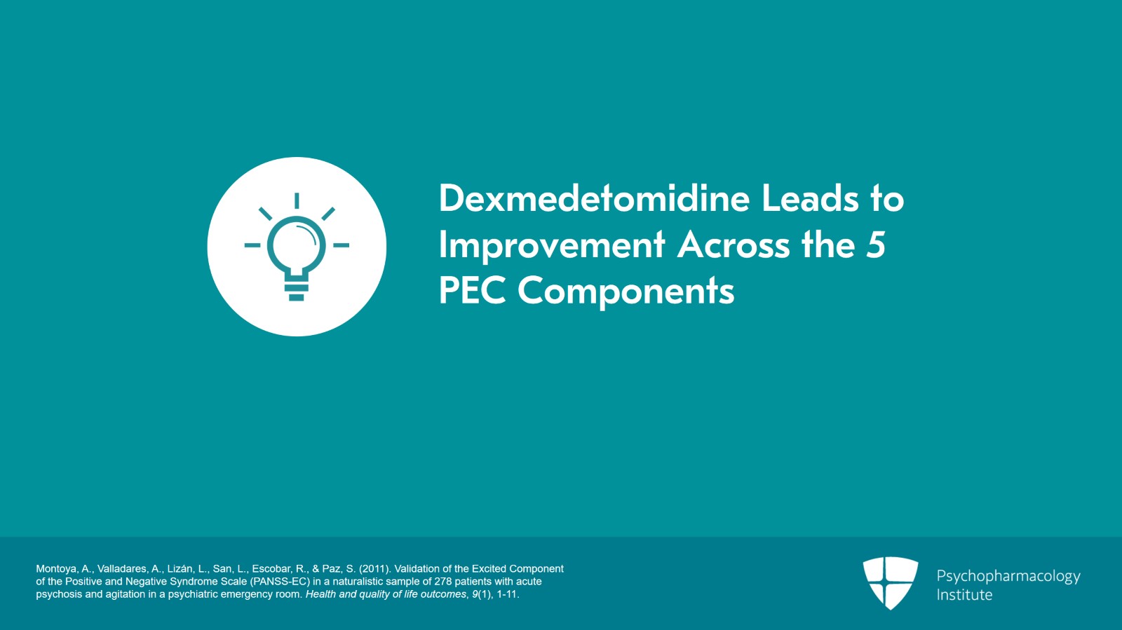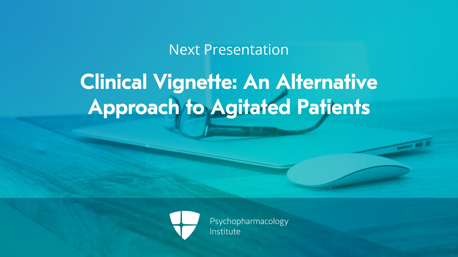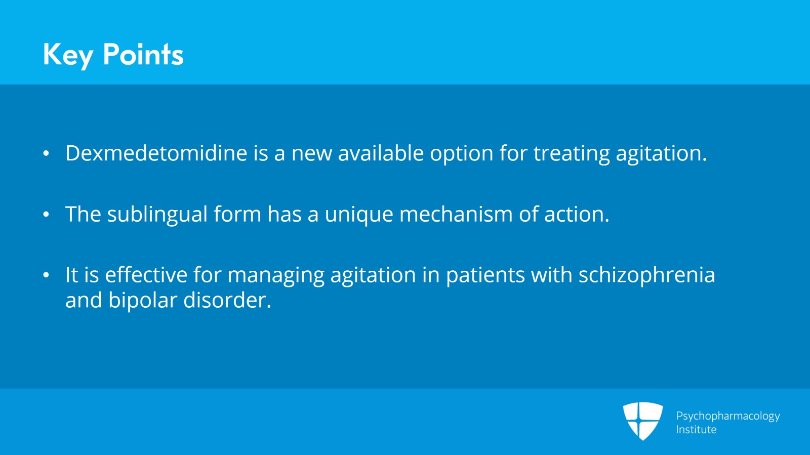 Next, dexmedetomidine is a new option that’s available for the treatment of agitation in a sublingual film formulation with a completely different mechanism of action, and it’s been shown to be effective for agitation in patients with schizophrenia and bipolar disorder.