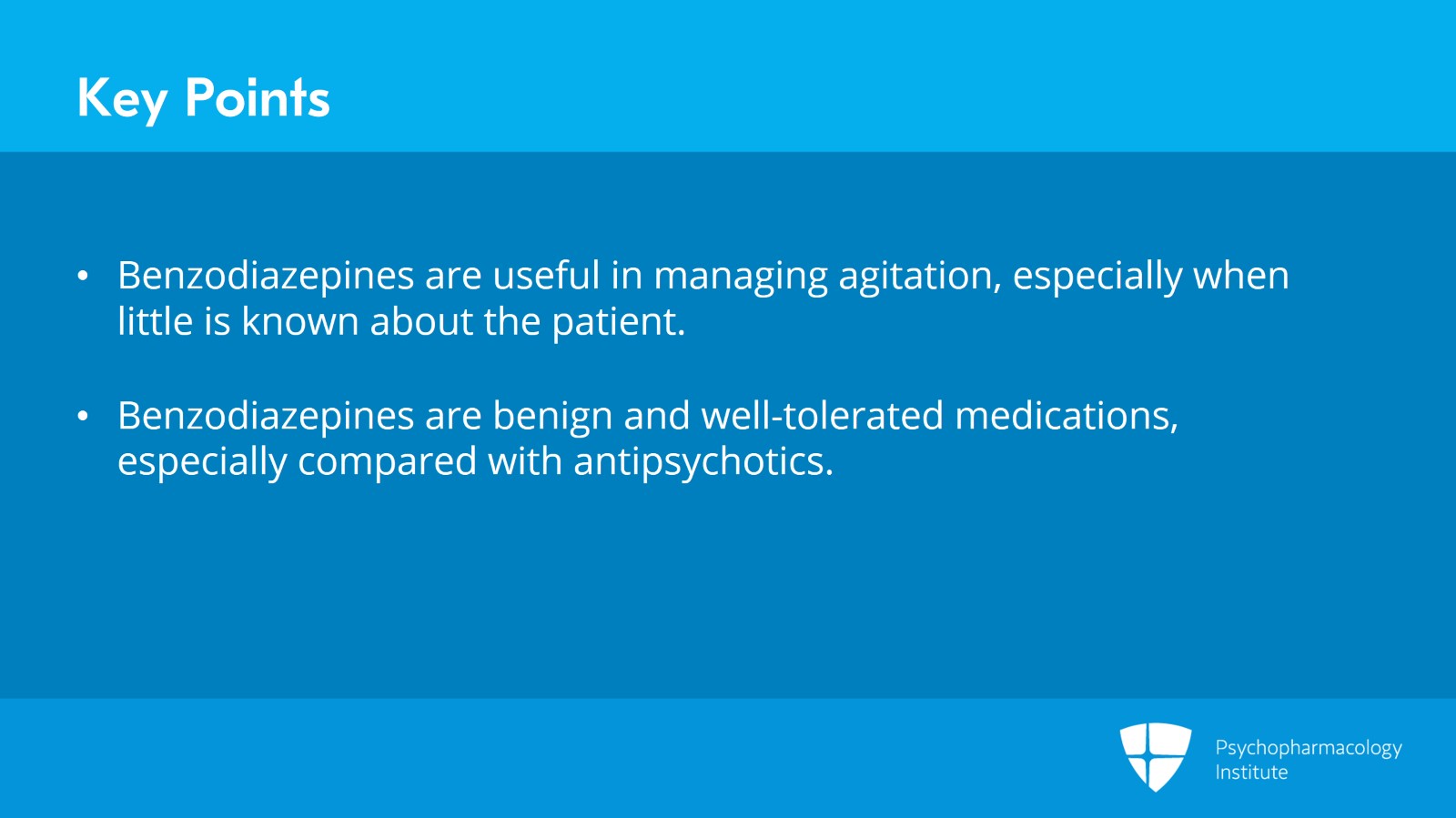 So, our key points from this discussion about benzodiazepines and new opportunities for treatment of agitation is that number one, benzodiazepines are useful in many different aspects of agitation, especially when we don’t know all that much about the patient or the causes of the agitation.