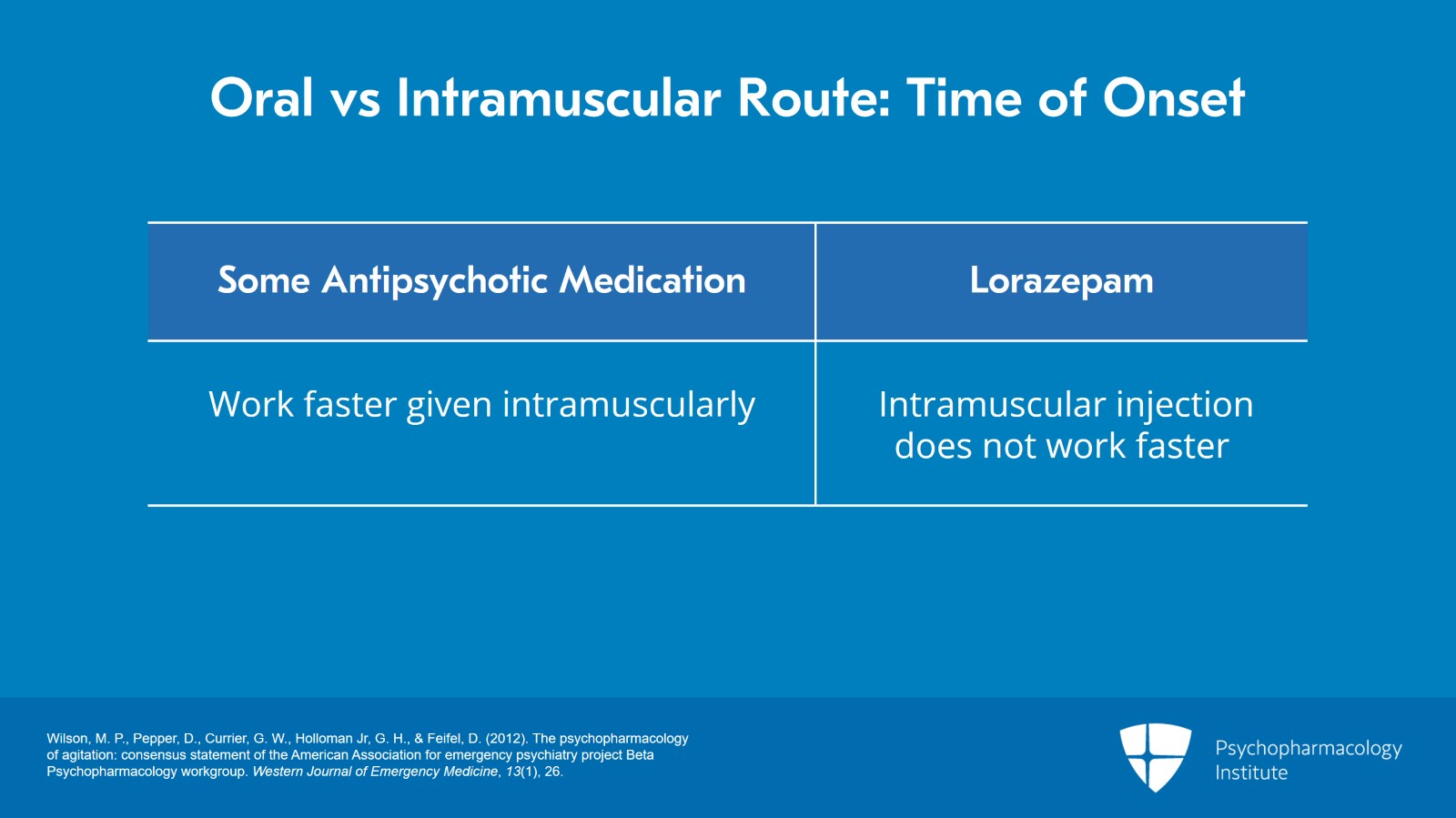 We do know that other antipsychotic meds, for example, work faster given as intramuscular than p.o. but it’s not the case with the lorazepam.