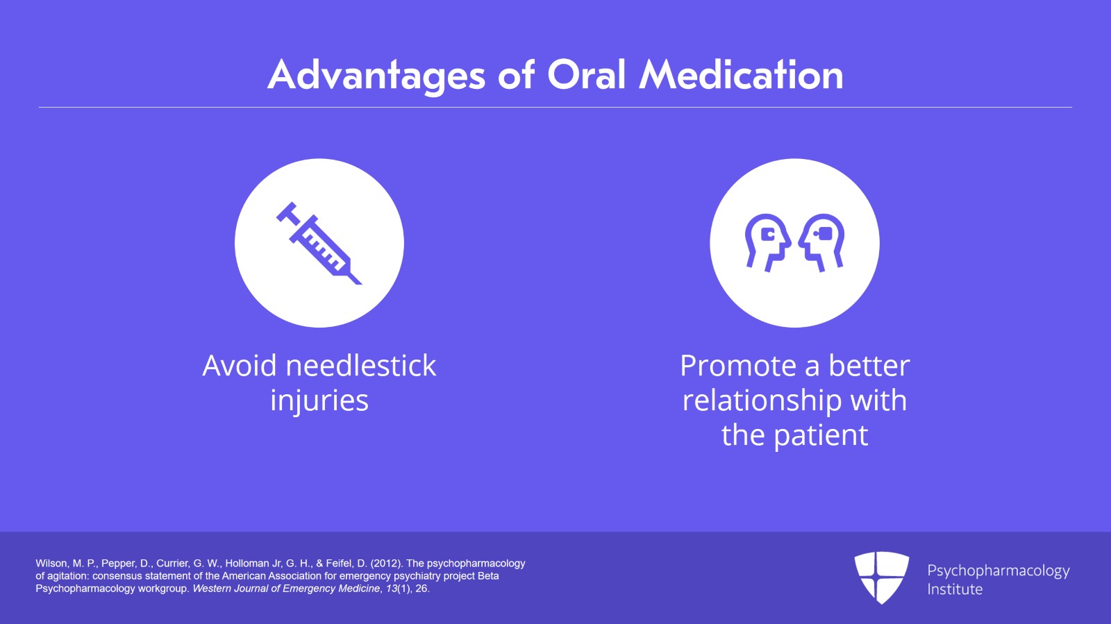 - Wilson, M. P., Pepper, D., Currier, G. W., Holloman Jr, G. H., & Feifel, D. (2012). The psychopharmacology of agitation: Consensus statement of the American Association for emergency psychiatry project Beta Psychopharmacology workgroup. Western Journal of Emergency Medicine, 13(1), 26.