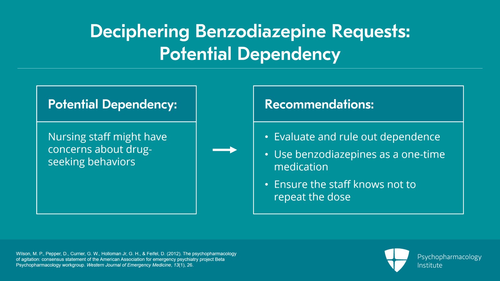 Nursing staff do have concerns at times that maybe a patient is drug seeking or they’re manipulating because they specifically want to get a benzodiazepine. That is something that you need to evaluate and rule out, and certainly, just don’t give the medication out like candy.