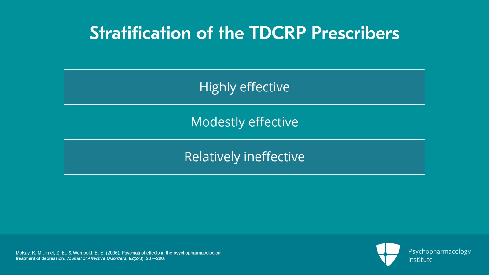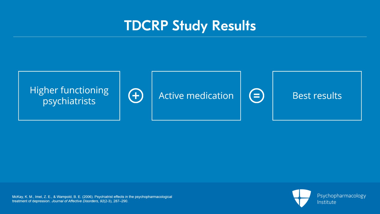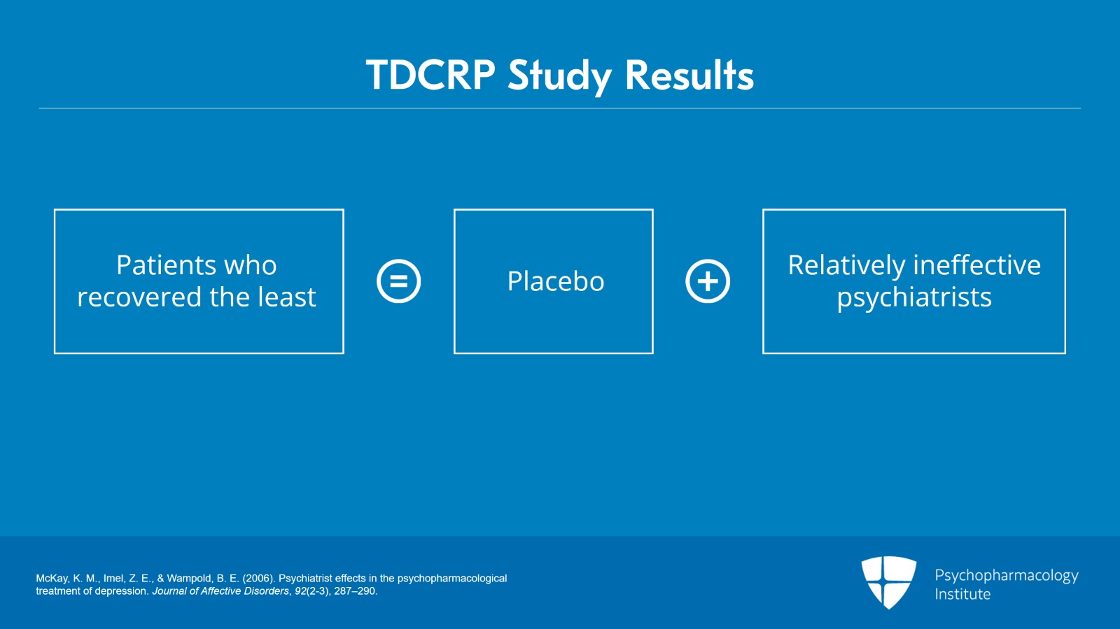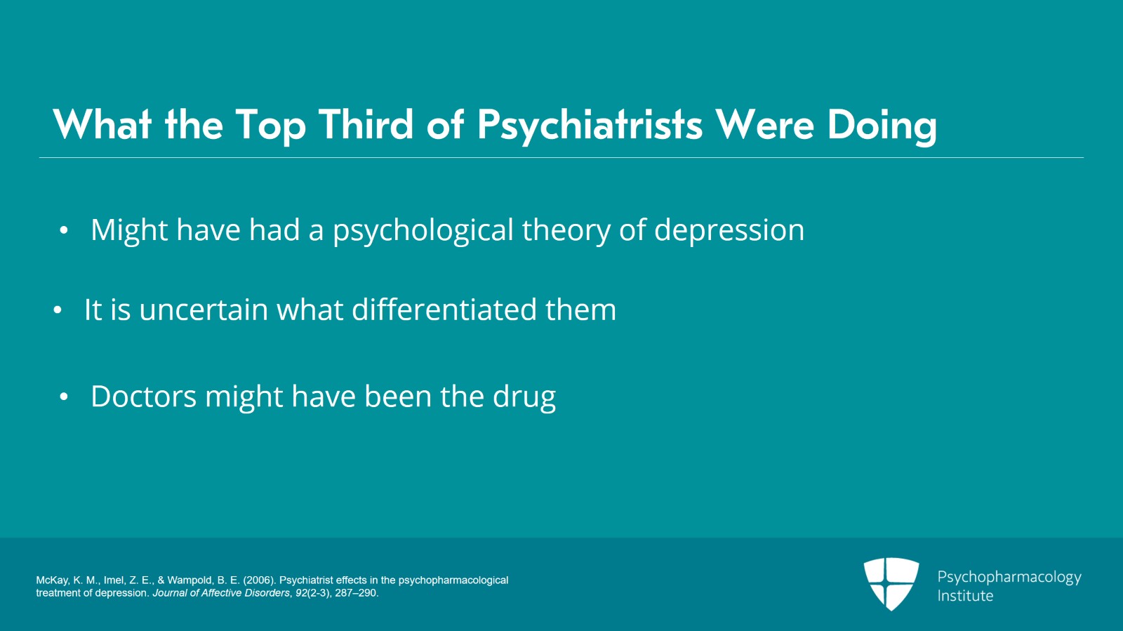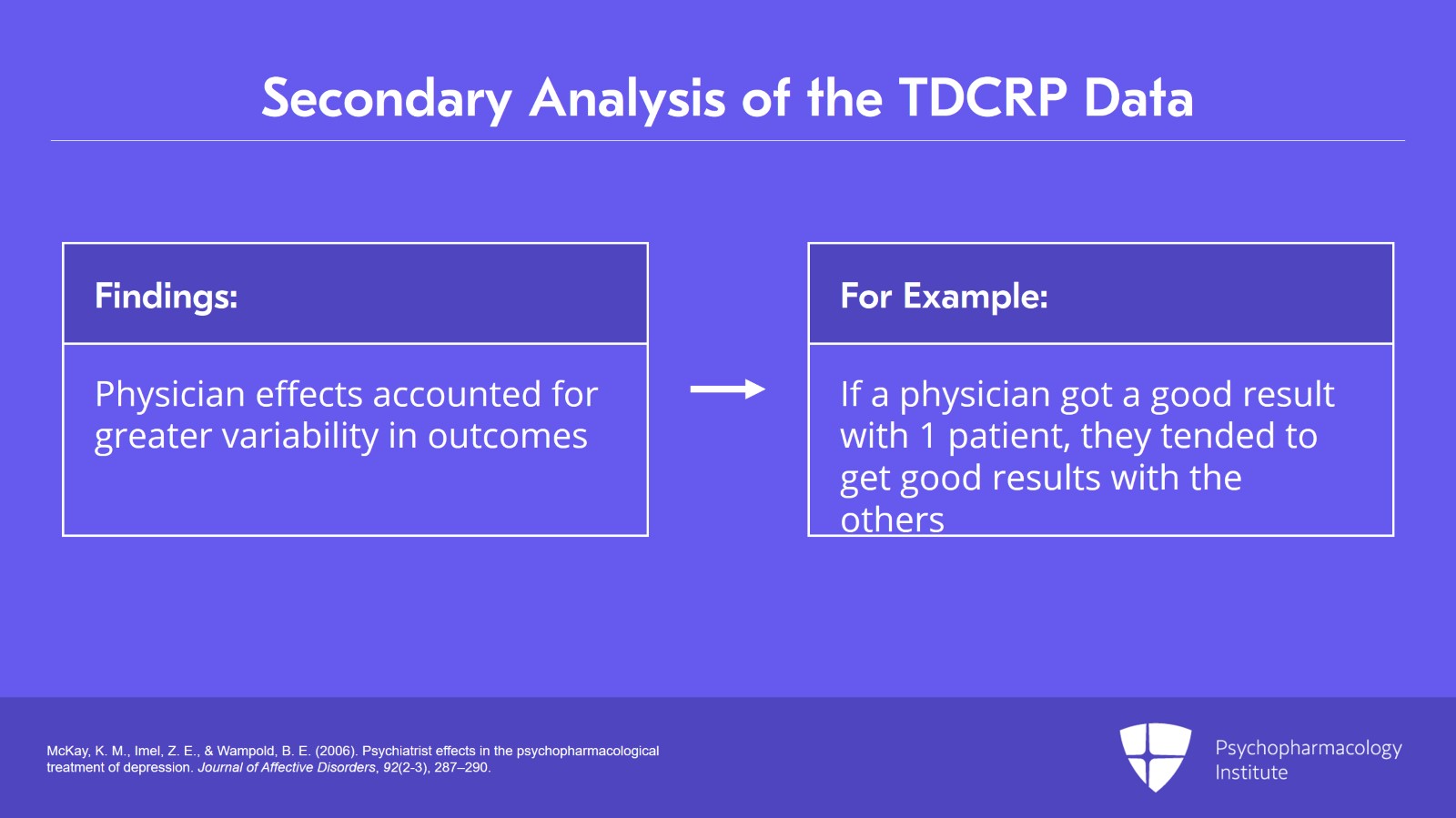 But McKay, Imel and Wampold in 2006 went back and did a secondary analysis of that data looking through the lens of the prescriber. And what they found interestingly was that physician effects accounted for greater variability in outcomes than did the medication condition itself. And so it turned out, for example, that if a physician got a good result with one patient, they tended to get good results with all the patients. And if a physician got poor results with a patient, they tended to get poor results with all the patients.