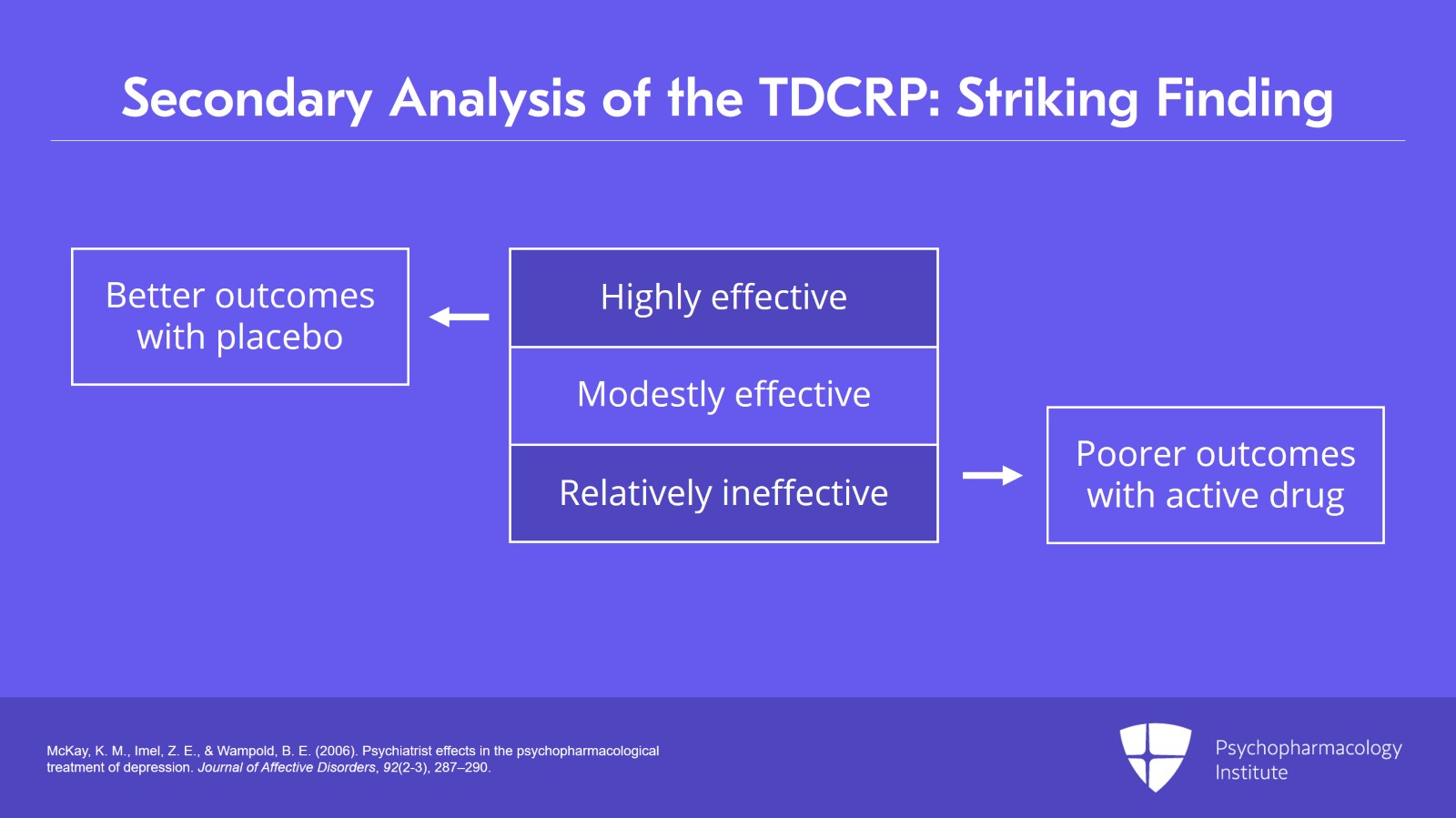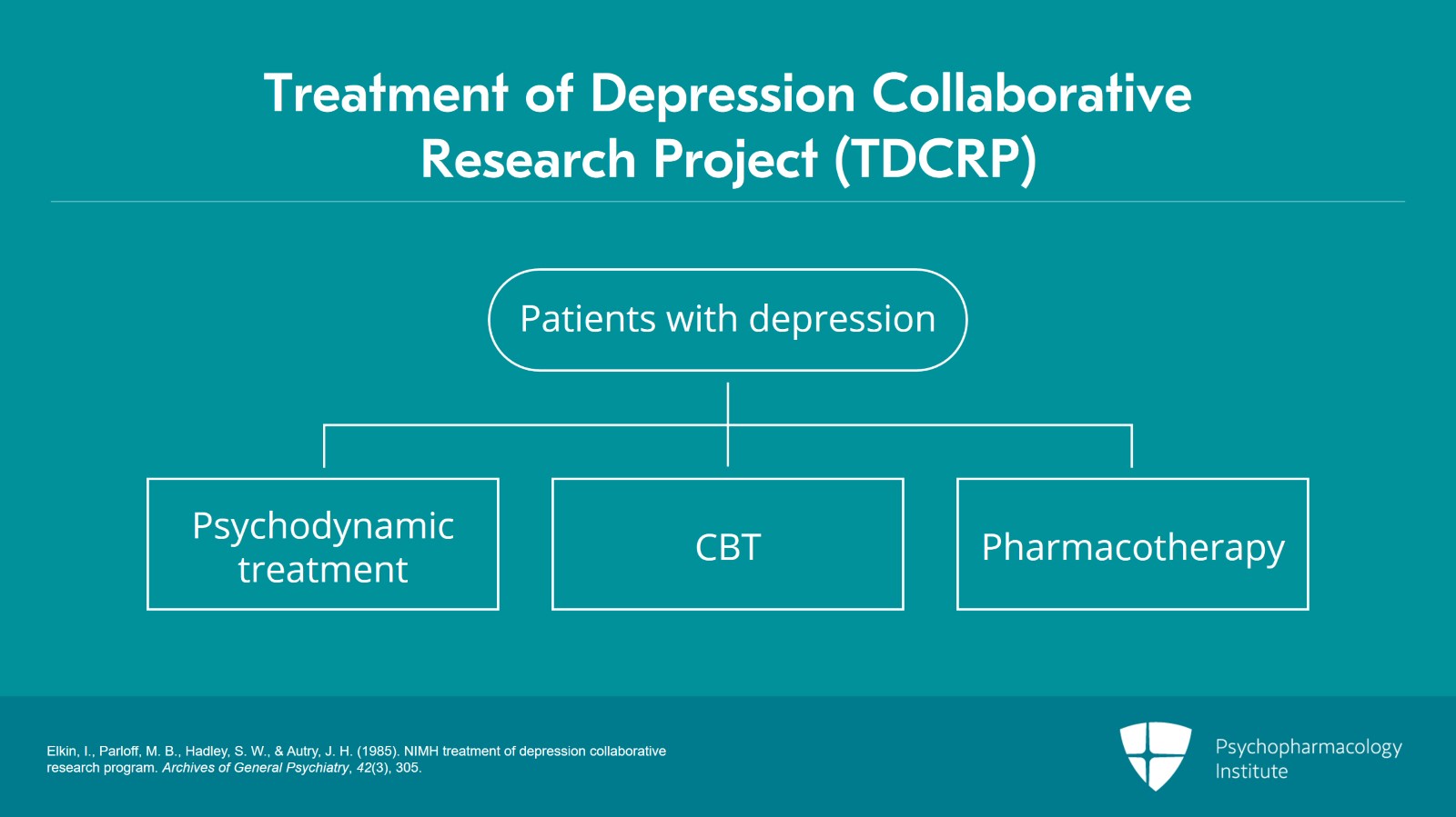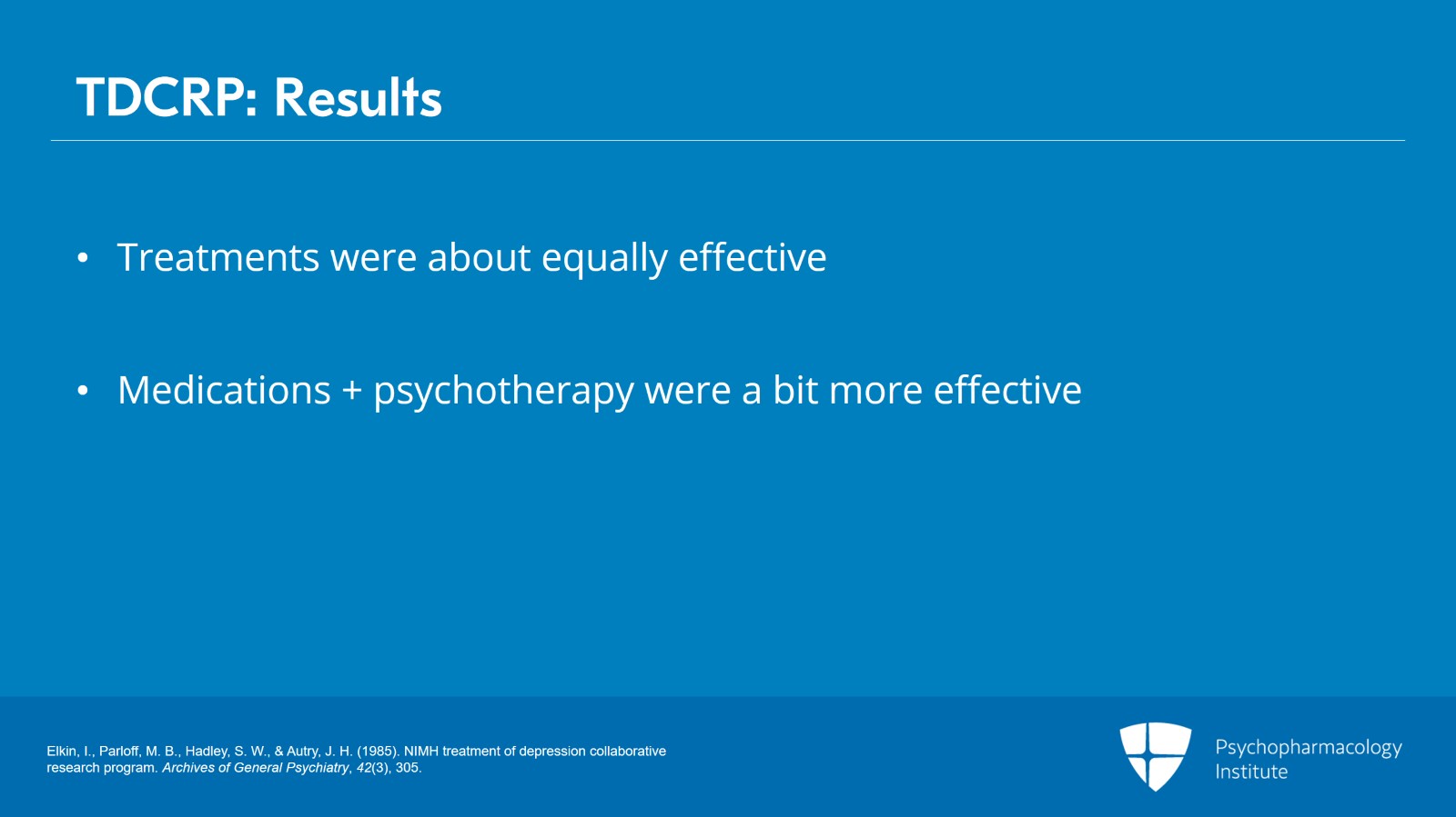 So for starters, I just want to highlight a study that I think cast this in a very clear light which is a secondary analysis of the TDCRP data. The TDCRP, the Treatment of Depression Collaborative Research Project was before STAR*D, the largest NIMH-funded, multicenter, placebo-controlled trial that had been done looking at treatments for depression. And in that study, they were comparing psychodynamic treatments or IPT, cognitive behavioral treatments and then pharmacotherapy.