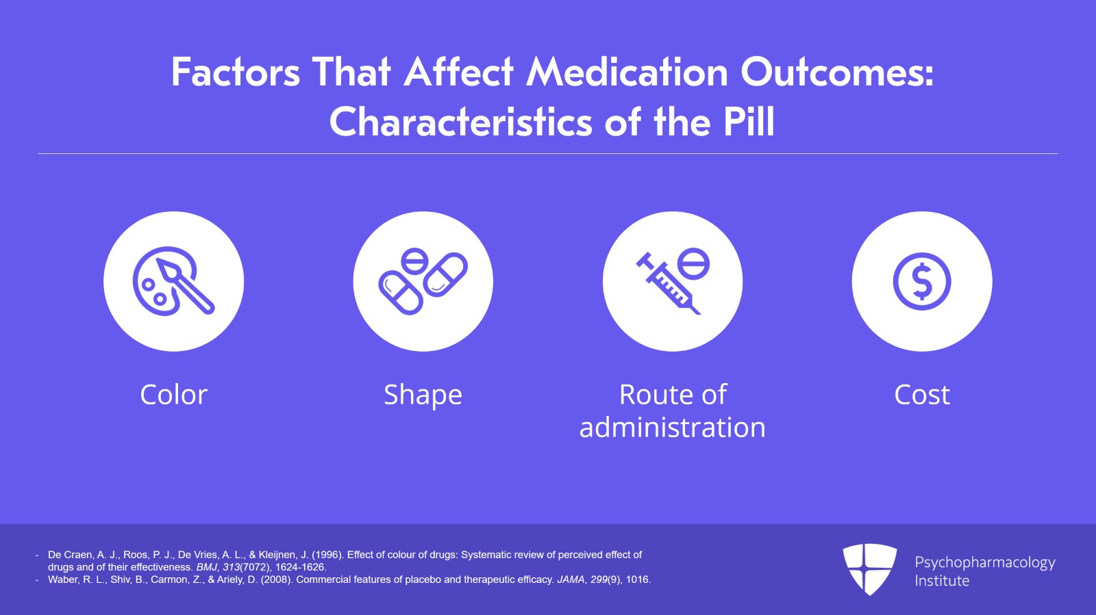 The characteristics of the pill also affect outcome. So the color of the pill makes a difference. And we know in terms of placebo research red pills tend to be energizing and blue pills tend to be calming in most cases but not all cases. We know shapes of the pills, the route of administration, all affect how well our pills work and expensive pills appear also to work better. So if a patient is in the course of a study is led to believe the pill they're taking is, you know, 25 cents or like $85, if the patient thinks they're getting the more expensive pill, they tend to have a bigger response.