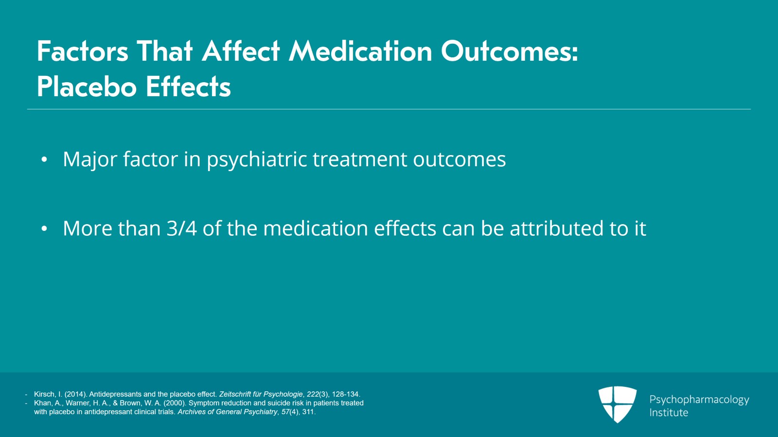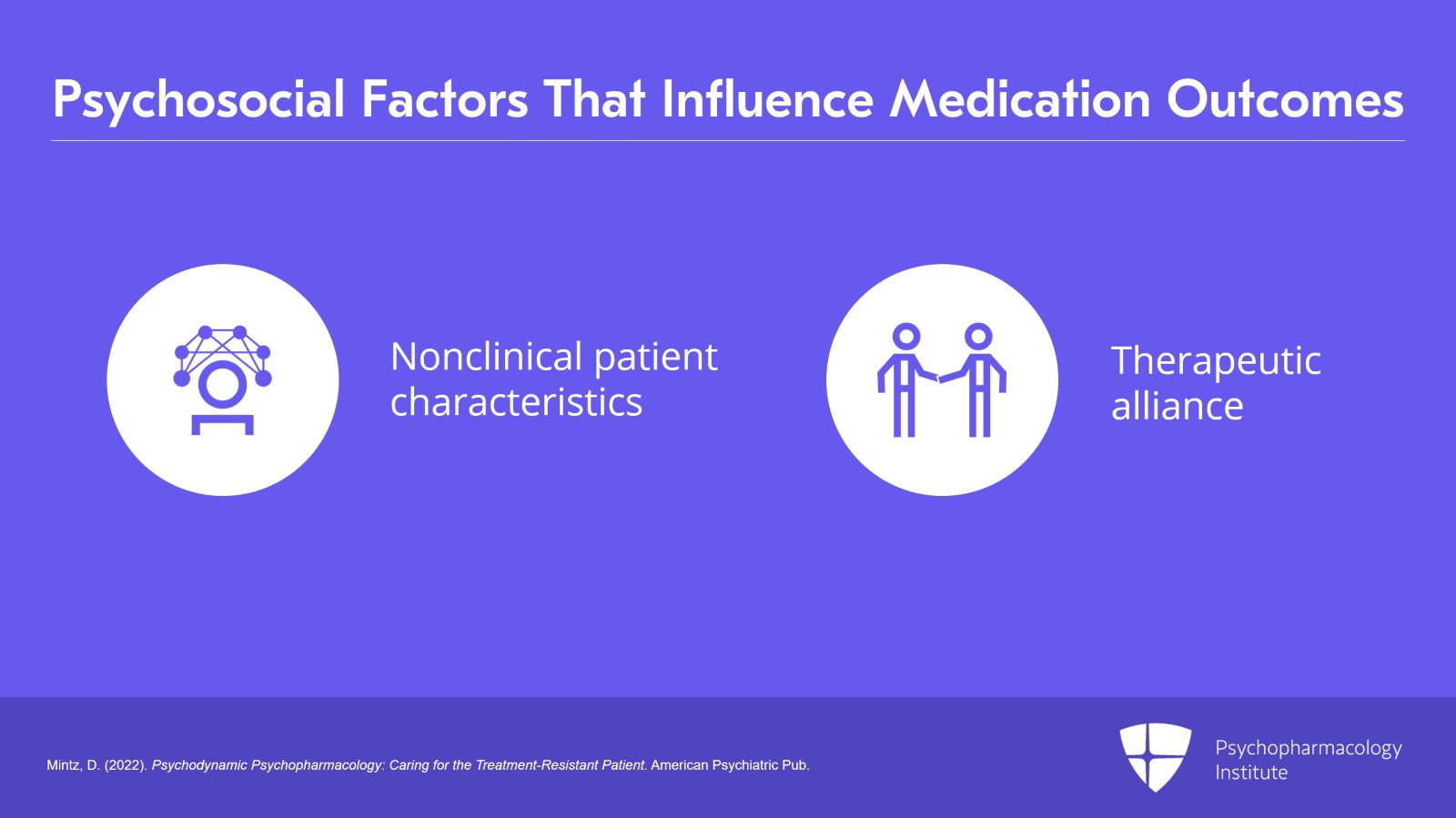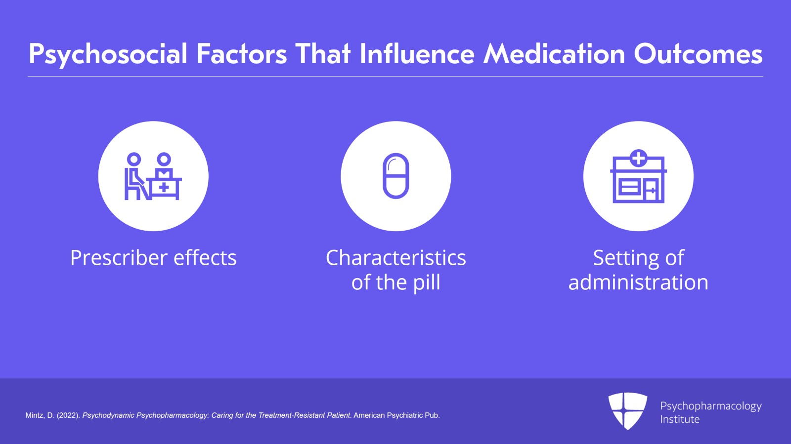 And it is probably important to say and it's been implied in everything I've said so far that medication outcomes, we know, are influenced by a range of psychosocial factors. This includes prescriber effects, characteristics of the pill, setting of administration which is why the gold standard of medication trials would be a multicenter placebo-controlled trial because I think we, we learned already in the 1950s and '60s that you could get fantastic results at one research site and nonsignificant results at another based on the patient population, the setting, the people. Mintz, D. (2022). Psychodynamic Psychopharmacology: Caring for the Treatment-Resistant Patient. American Psychiatric Pub.