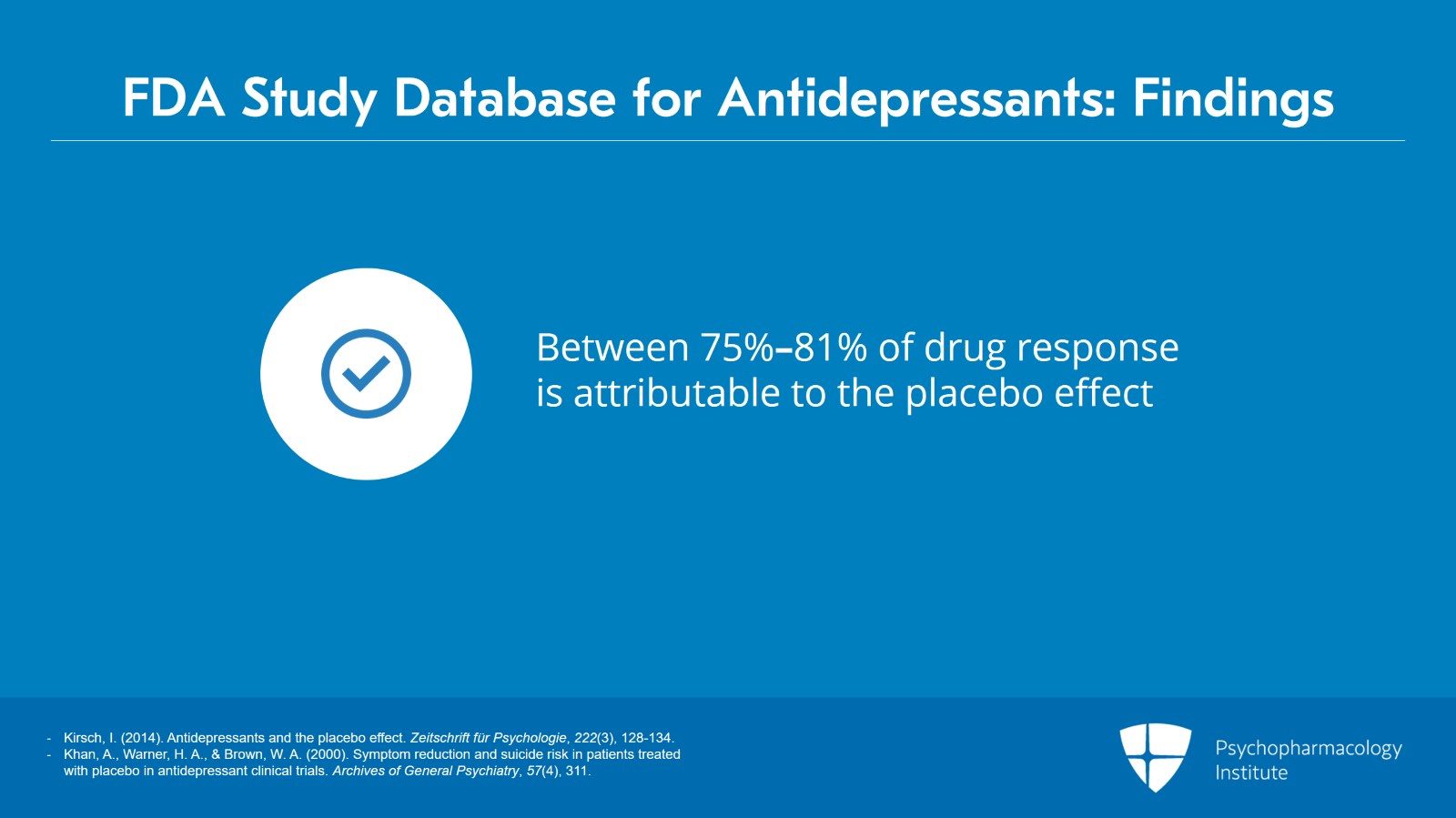 But a number of researchers have looked at a relatively unbiased sample which is the FDA drug study database. And when you're proposing a new medication, you tell the FDA, I am going to do these studies and the FDA gets all those studies whether they have a positive finding or a negative finding. So that's a relatively unbiased sample. And a number of researchers, Kirsch and Sapirstein; Khan, Warner and Brown; and Kirsch, Moore and Scoboria, all looked at this particular database. And when looking at that database for antidepressants, what they found was somewhere between 75% and 81% of drug response with antidepressants is attributable to the placebo effect.