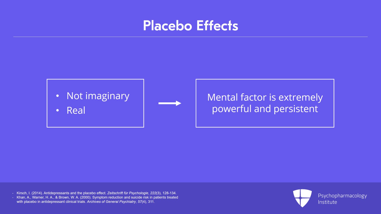 - Khan, A., Warner, H. A., & Brown, W. A. (2000). Symptom reduction and suicide risk in patients treated with placebo in antidepressant clinical trials. Archives of General Psychiatry, 57(4), 311.