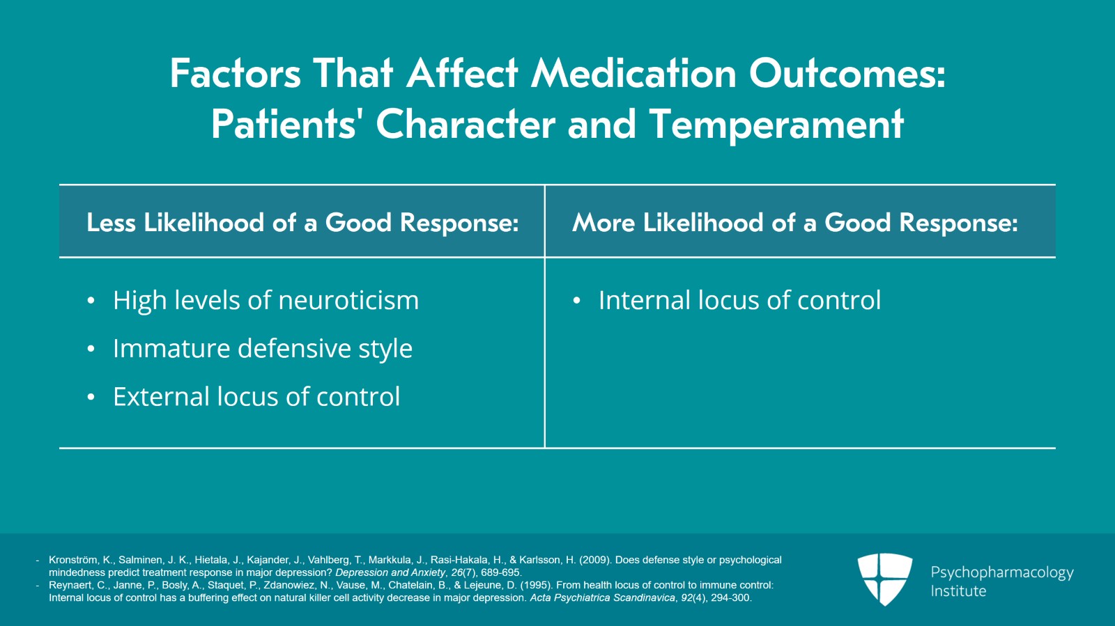 Another factor in terms of who the patient is that influences how medications are going to work is character and temperament. So we know that our patients with higher levels of neuroticism are less likely to have a good antidepressant response. Similarly, patients with immature defensive style are also less likely to have a good antidepressant response and these are patients for whom combination at least with psychotherapy is probably indicated. Patients who have an internal locus of control actually do better with antidepressants than patients who have an external locus of control.