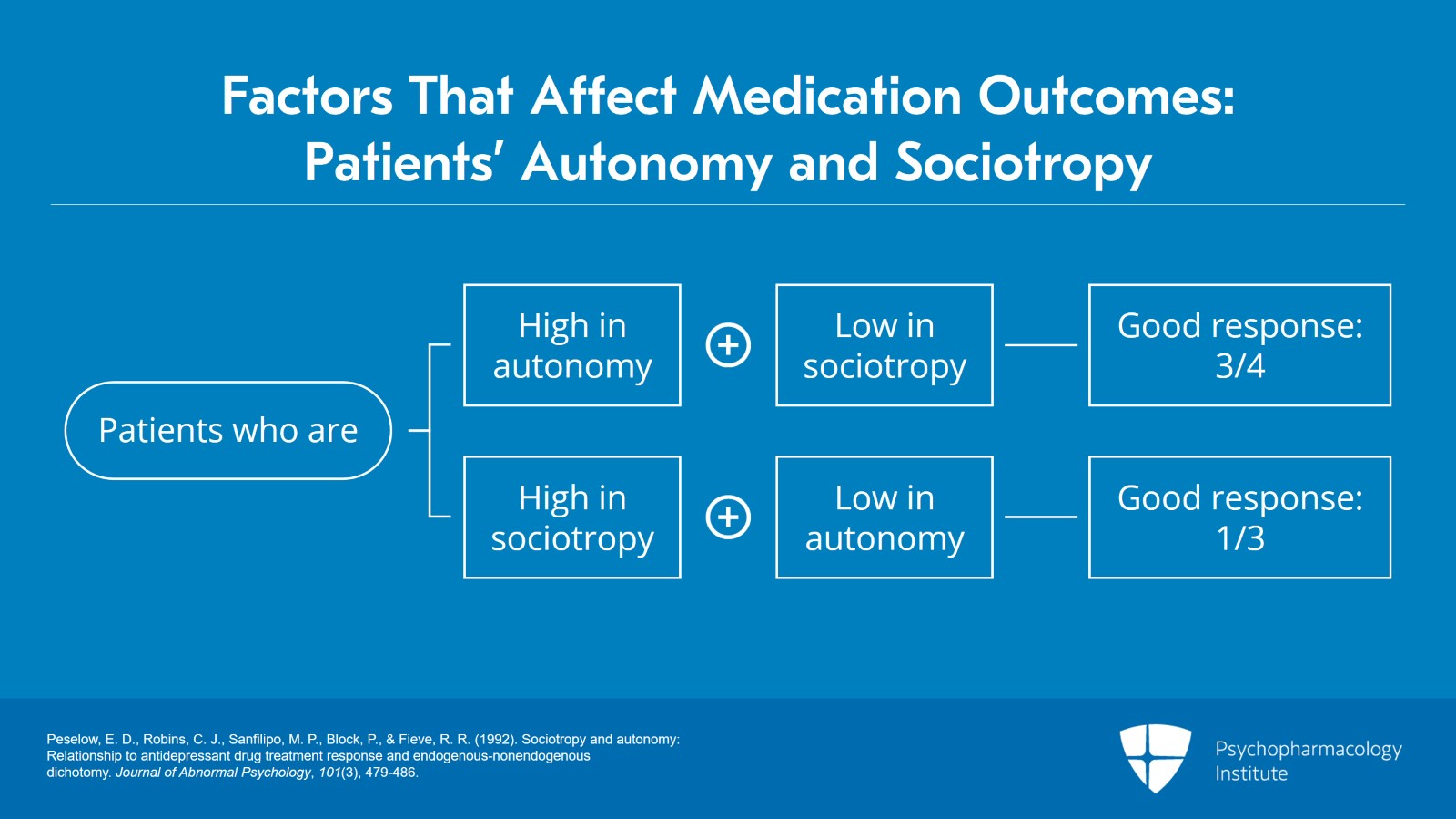And the dimensions of autonomy and sociotropy also influence medication outcomes. So I think you understand what autonomy is, people who feel like they're self-motivated, in charge of themselves, you know, willing to go their own way. Sociotropy is a personality characteristic where people are highly attuned to their social environment, anxiously attuned. They want to please. They have a hard time disagreeing and are really quite concerned with their standing with other people. So patients who are high in autonomy and low in sociotropy have, about 3/4 of them will have a good antidepressant response. Whereas, patients who are high in sociotropy and low in autonomy, only about a third of those patients will have a good antidepressant response.