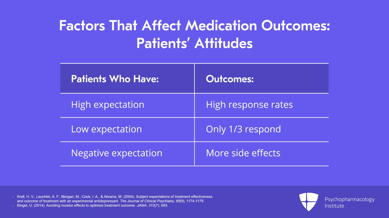 Our patients' attitudes also affect how well medications are going to work. So we know that patients who have very high expectations of treatment also have very high response rates, as much as 90% to antidepressants. Whereas, those patients who have a low expectation, only about a third of those are going to respond to antidepressants. And also, in terms of expectations, we know that negative expectations of treatment make it more likely that patients are going to experience side effects which really are in many cases nocebo responses related to the expectation of being harmed.