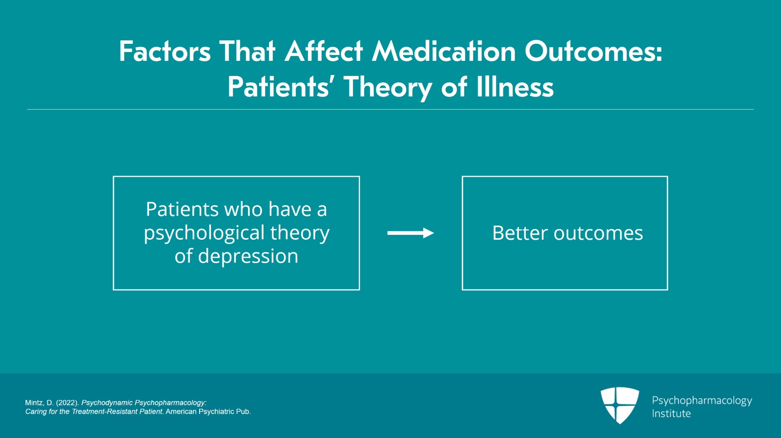 In terms of patient attitudes also, lastly, it is worth noting that the patient's theory of illness influences how their medications are going to work. So it turns out actually that patients who have a psychological theory of depression, who view their depression as nonbiologic tend actually to have better outcomes with antidepressants at least with mild-to-moderate depression. It seems like once you get into severe depression this, this demarcation does not hold. But for patients with mild-to-moderate depression, they are more likely to benefit if they see their depression as psychologic.