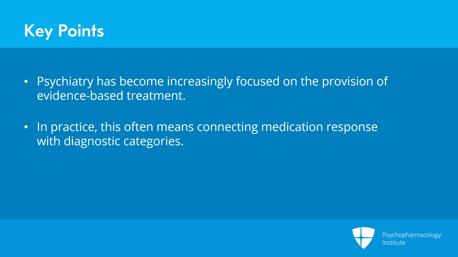 So just to reiterate, some key points: First of all, I think while Psychiatry has become increasingly focused on the provision of evidence-based treatment. In practice this is often meant to focus on the biomedical evidence base which connects medication response with particular diagnostic categories.
