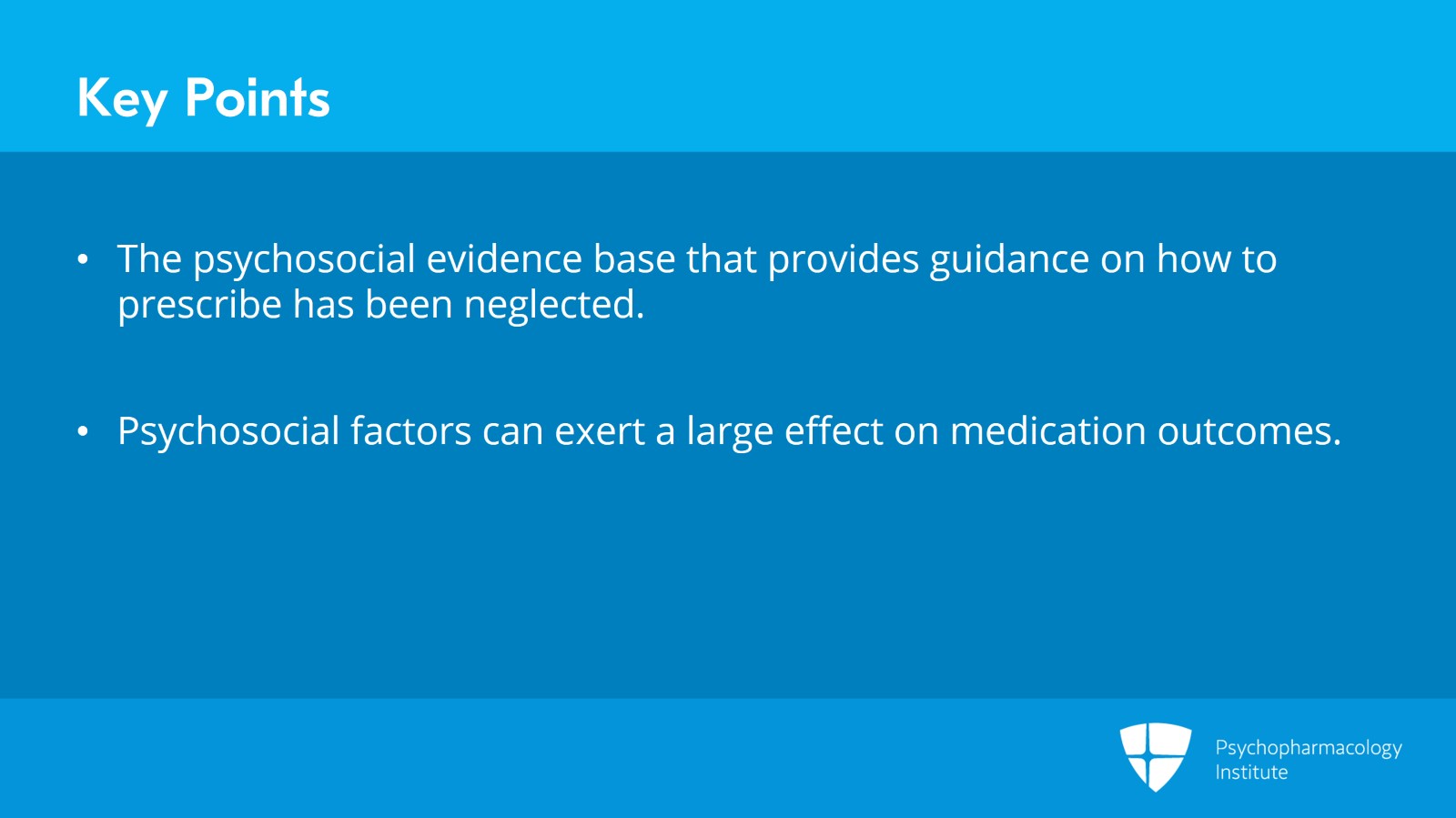And at the same time, there has been a general neglect of the psychosocial evidence base that I'm describing that provides guidance to the prescriber on how to prescribe rather than on what to prescribe in order to achieve optimum outcomes. In many cases actually, psychosocial factors exert a larger effect on medication outcome than does the actual medication.