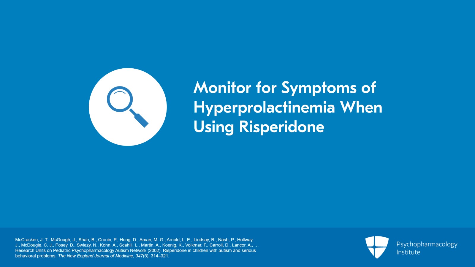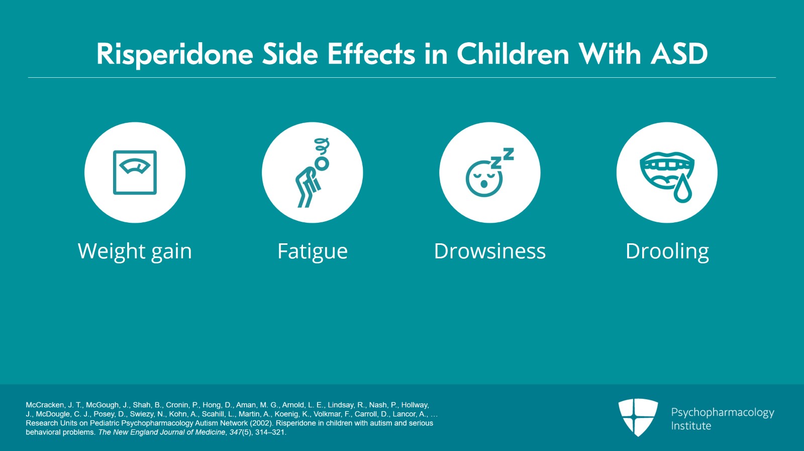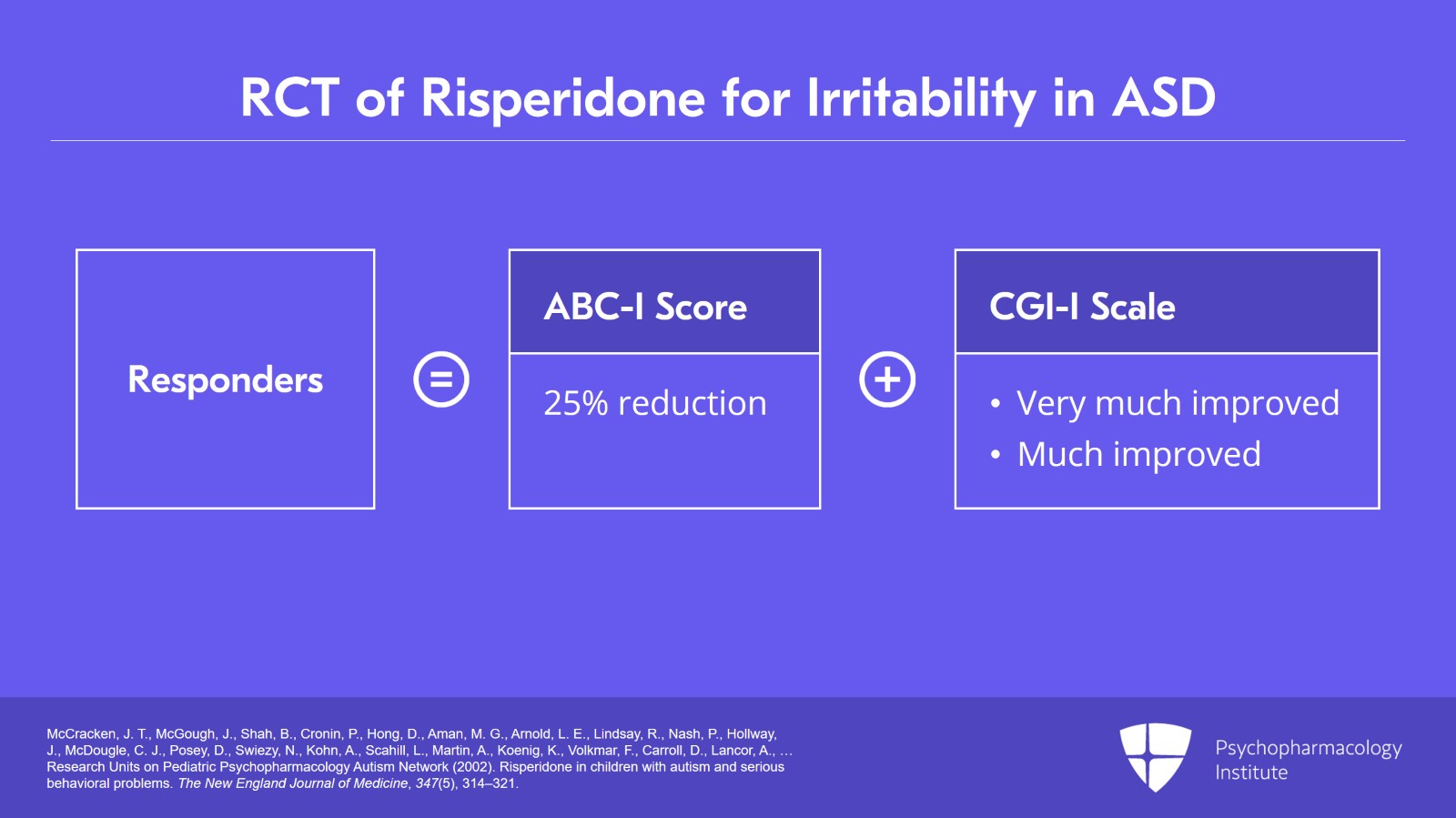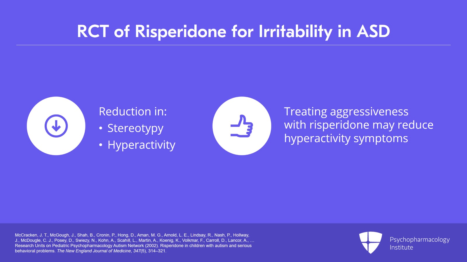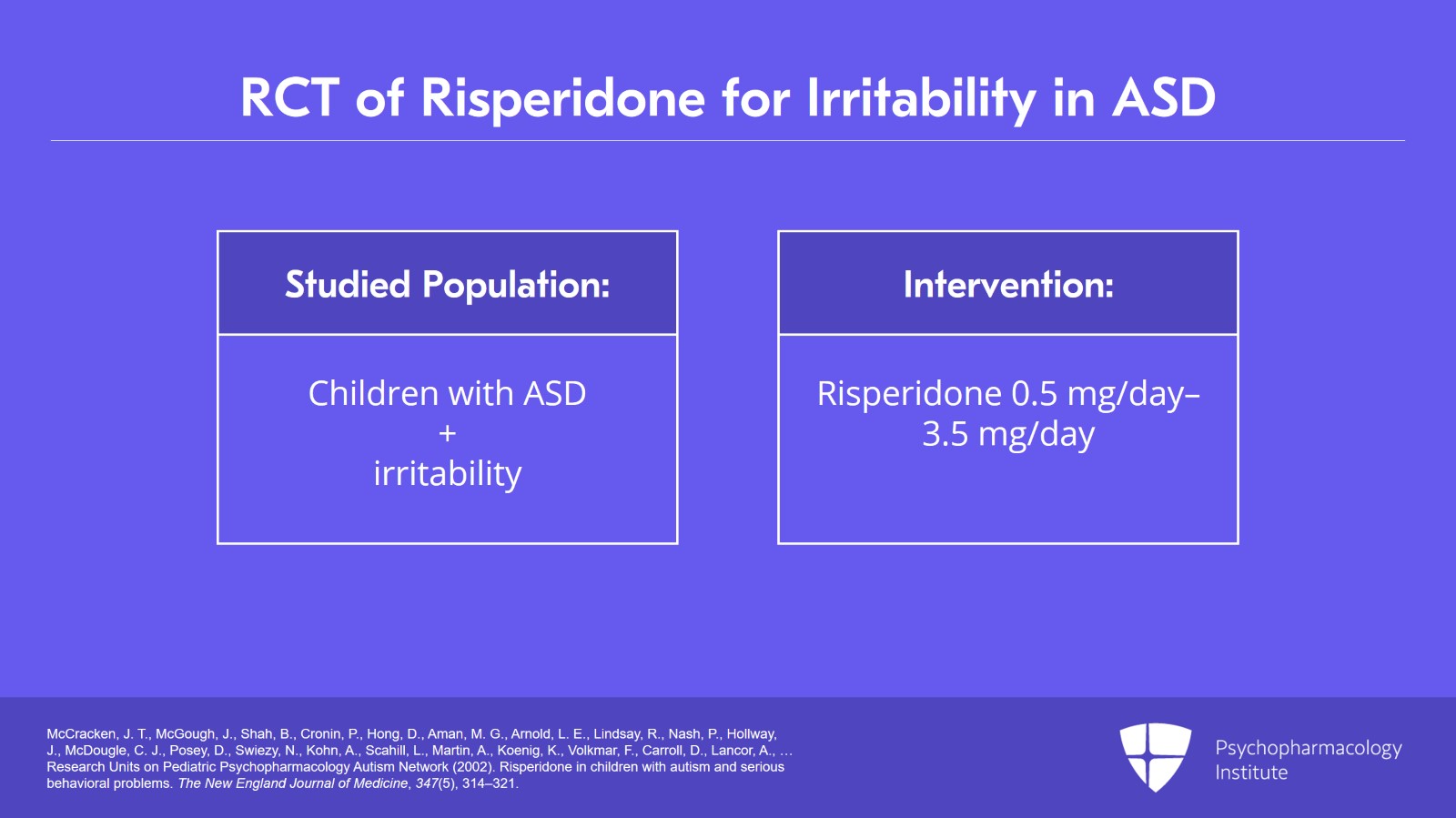 - McCracken, J. T., McGough, J., Shah, B., Cronin, P., Hong, D., Aman, M. G., Arnold, L. E., Lindsay, R., Nash, P., Hollway, J., McDougle, C. J., Posey, D., Swiezy, N., Kohn, A., Scahill, L., Martin, A., Koenig, K., Volkmar, F., Carroll, D., Lancor, A., … Research Units on Pediatric Psychopharmacology Autism Network (2002). Risperidone in children with autism and serious behavioral problems. The New England Journal of Medicine, 347(5), 314–321.