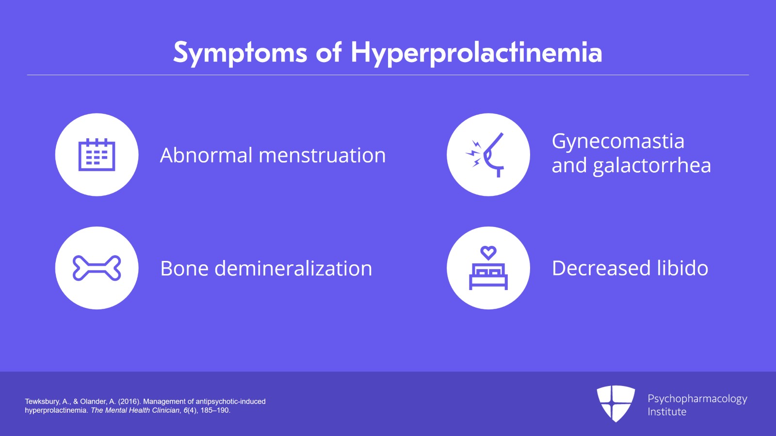 - Tewksbury, A., & Olander, A. (2016). Management of antipsychotic-induced hyperprolactinemia. The Mental Health Clinician, 6(4), 185–190.