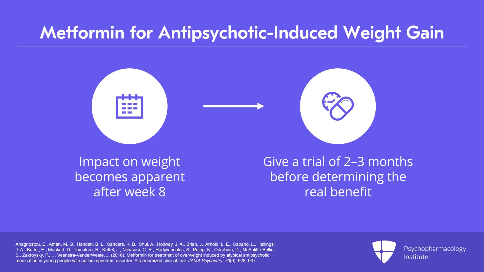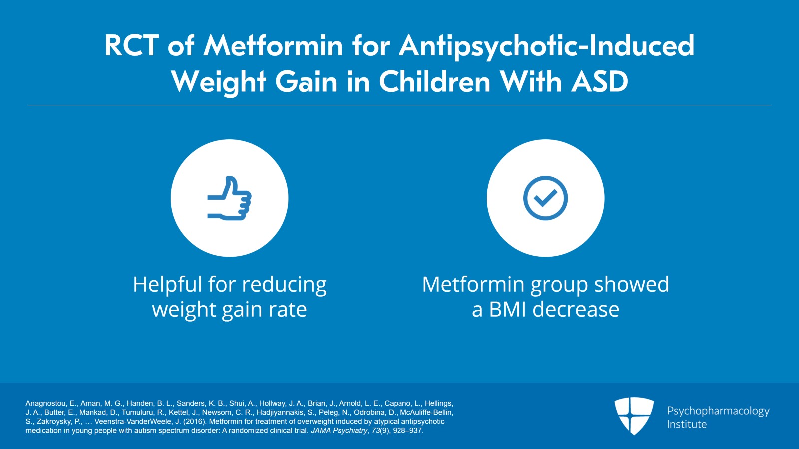 - Anagnostou, E., Aman, M. G., Handen, B. L., Sanders, K. B., Shui, A., Hollway, J. A., Brian, J., Arnold, L. E., Capano, L., Hellings, J. A., Butter, E., Mankad, D., Tumuluru, R., Kettel, J., Newsom, C. R., Hadjiyannakis, S., Peleg, N., Odrobina, D., McAuliffe-Bellin, S., Zakroysky, P., … Veenstra-VanderWeele, J. (2016). Metformin for treatment of overweight induced by atypical antipsychotic medication in young people with autism spectrum disorder: A randomized clinical trial. JAMA Psychiatry, 73(9), 928–937.