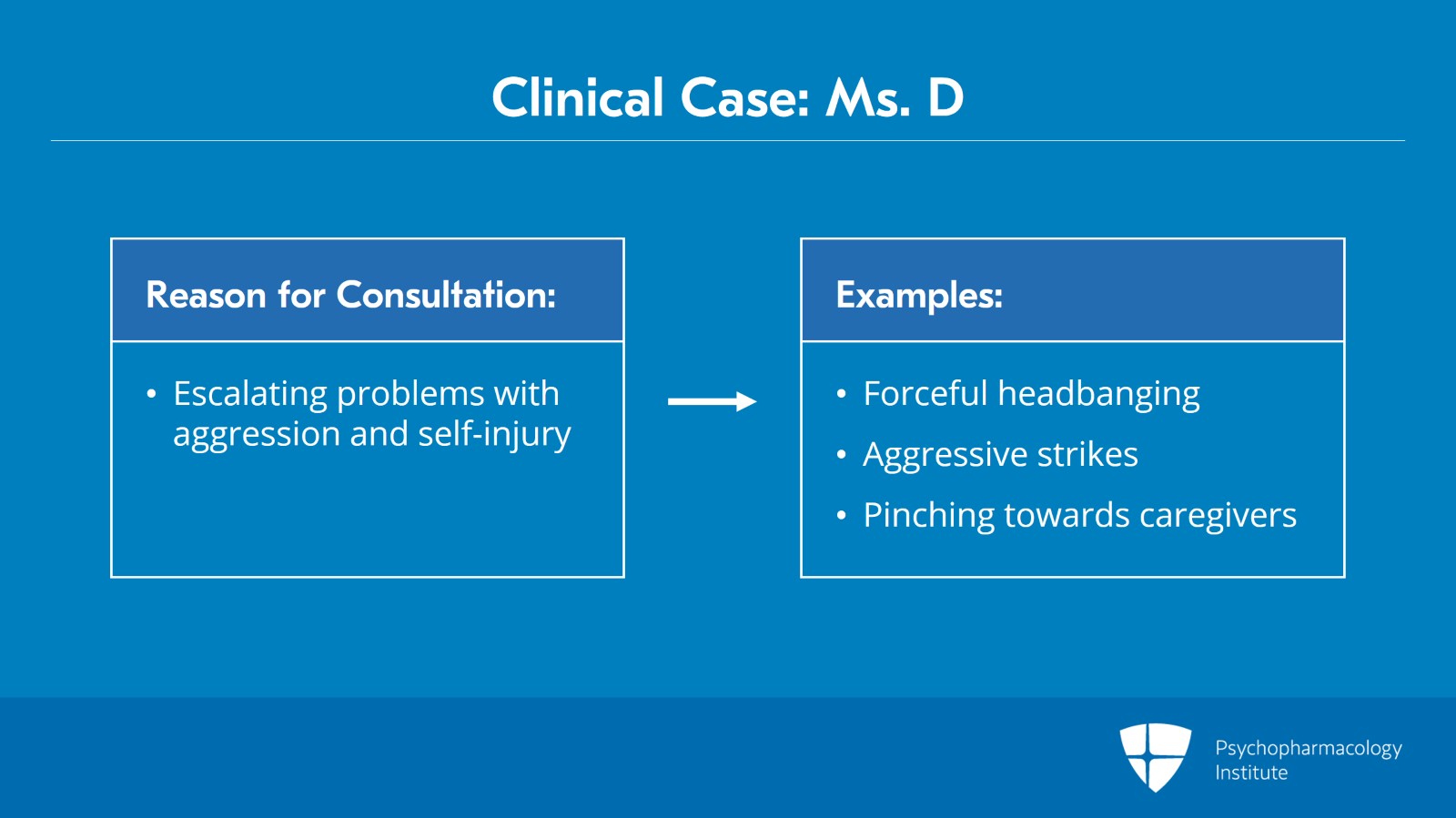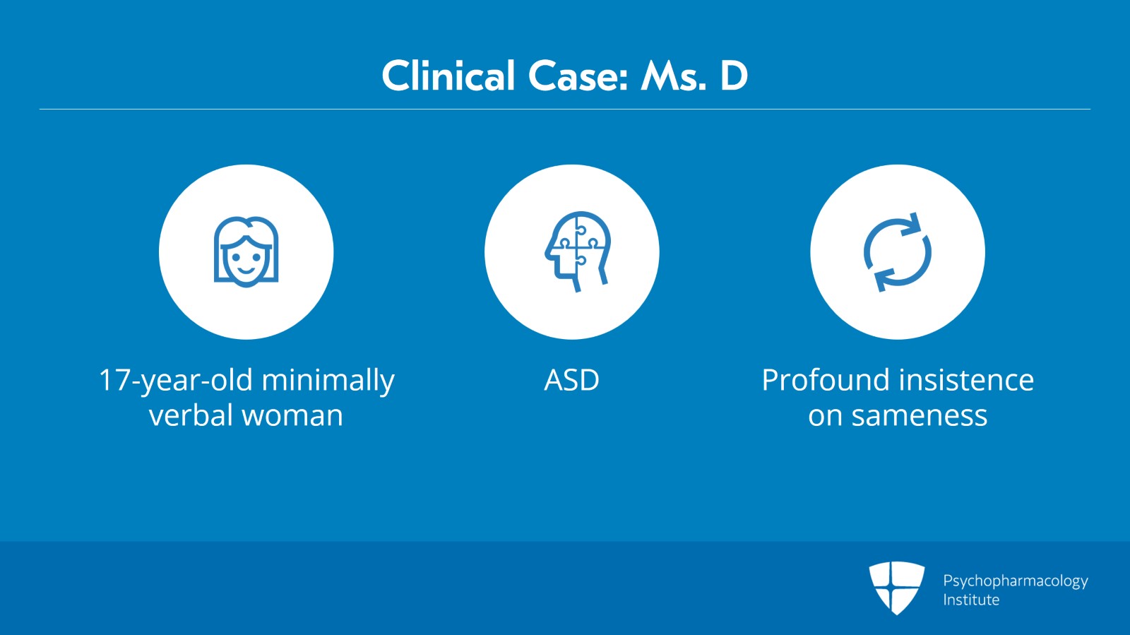 We'll start with talking about a case. Ms. D is a 17-year-old minimally verbal woman with autism spectrum disorder and a profound insistence on sameness, ritual and routine.