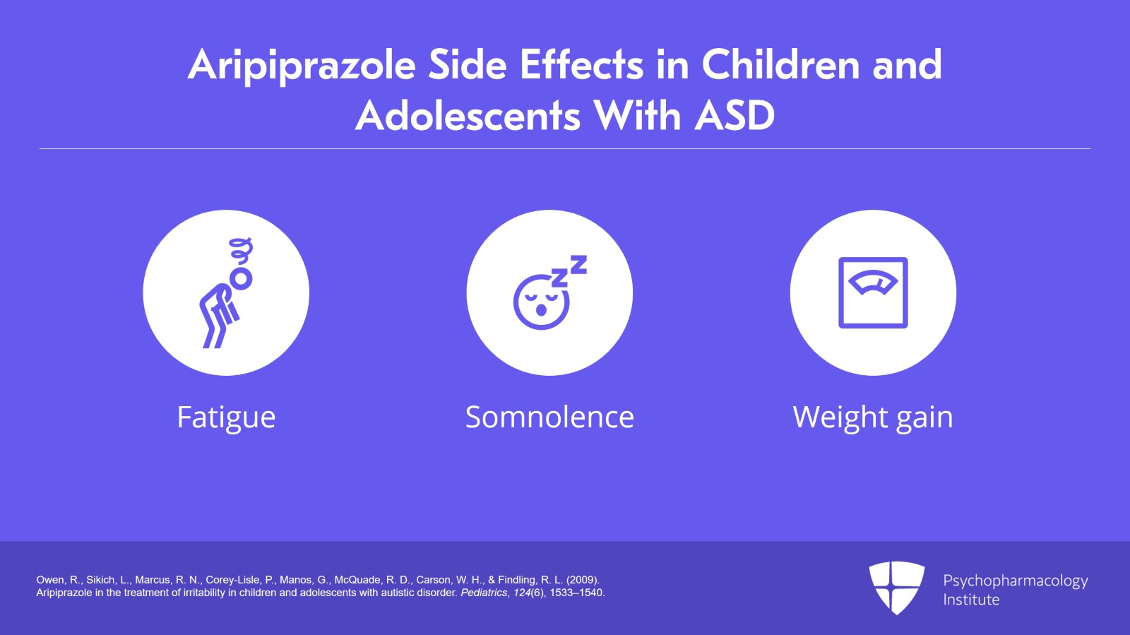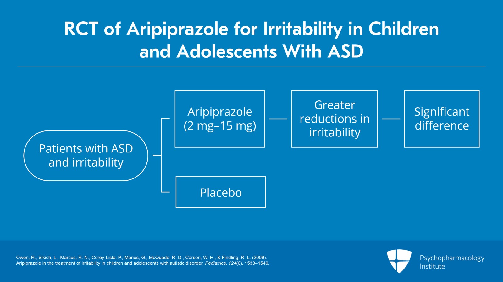 - Owen, R., Sikich, L., Marcus, R. N., Corey-Lisle, P., Manos, G., McQuade, R. D., Carson, W. H., & Findling, R. L. (2009). Aripiprazole in the treatment of irritability in children and adolescents with autistic disorder. Pediatrics, 124(6), 1533–1540.