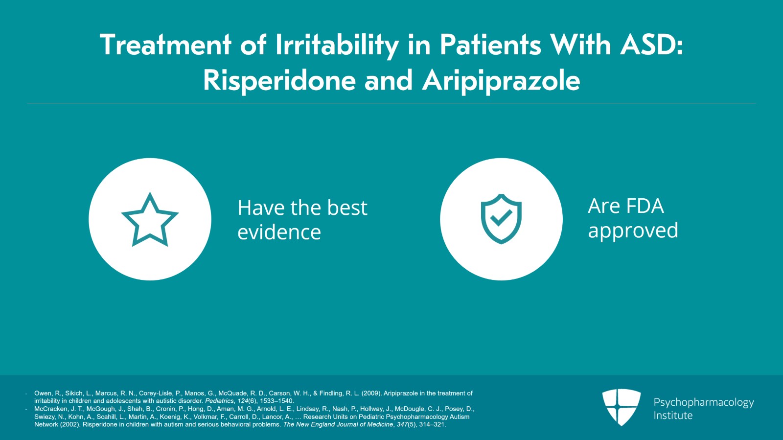So the clinical approach for the treatment of irritability in patients with autism spectrum disorder, clinicians should know there's the best evidence for risperidone and aripiprazole which both carry an FDA indication for the treatment of irritability.
