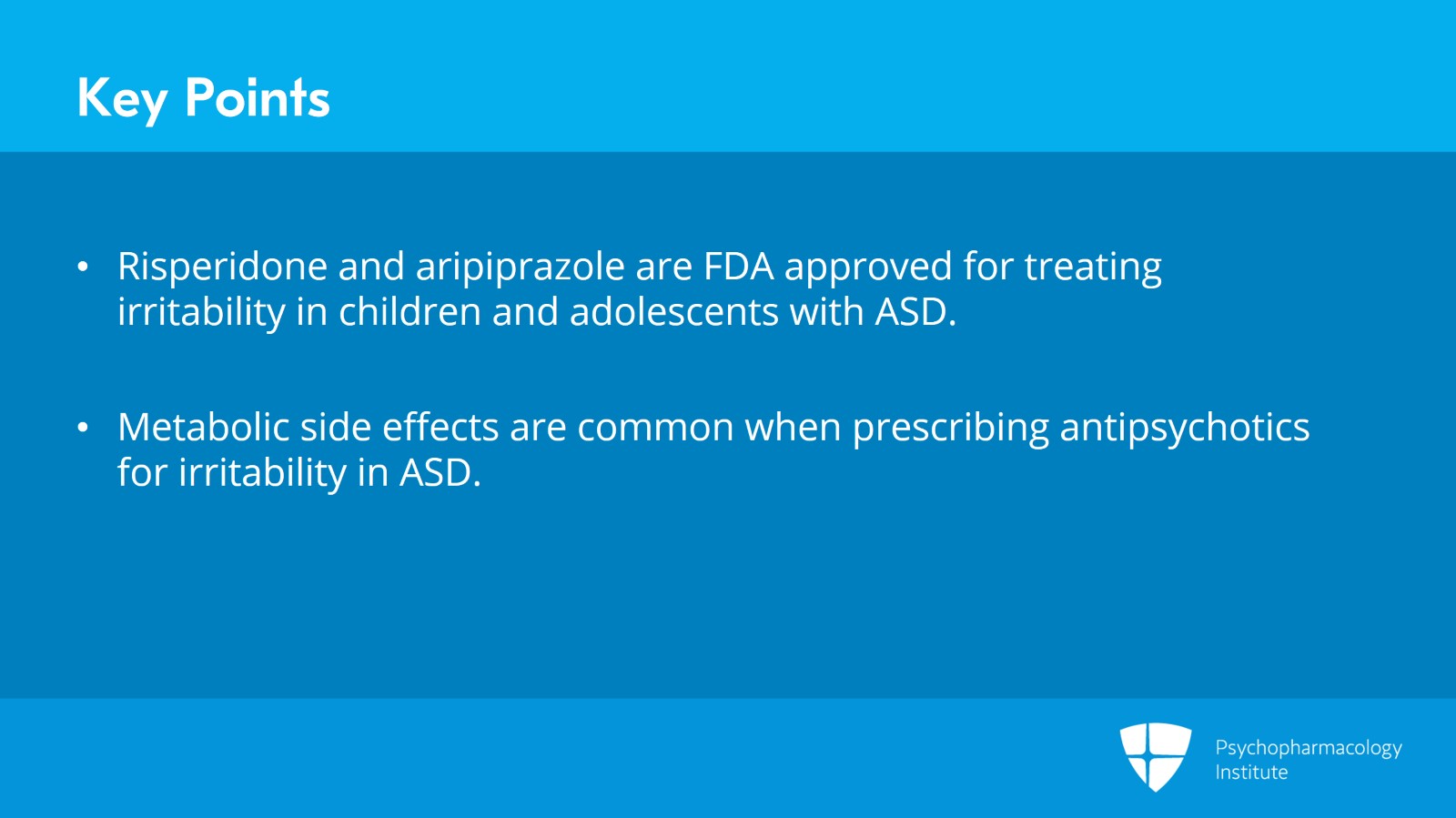 Key points to draw from this section include: Risperidone and aripiprazole carry an FDA indication for the treatment of irritability in children and adolescents with autism. Metabolic side effects including weight gain are common when prescribing antipsychotics for irritability in autism.