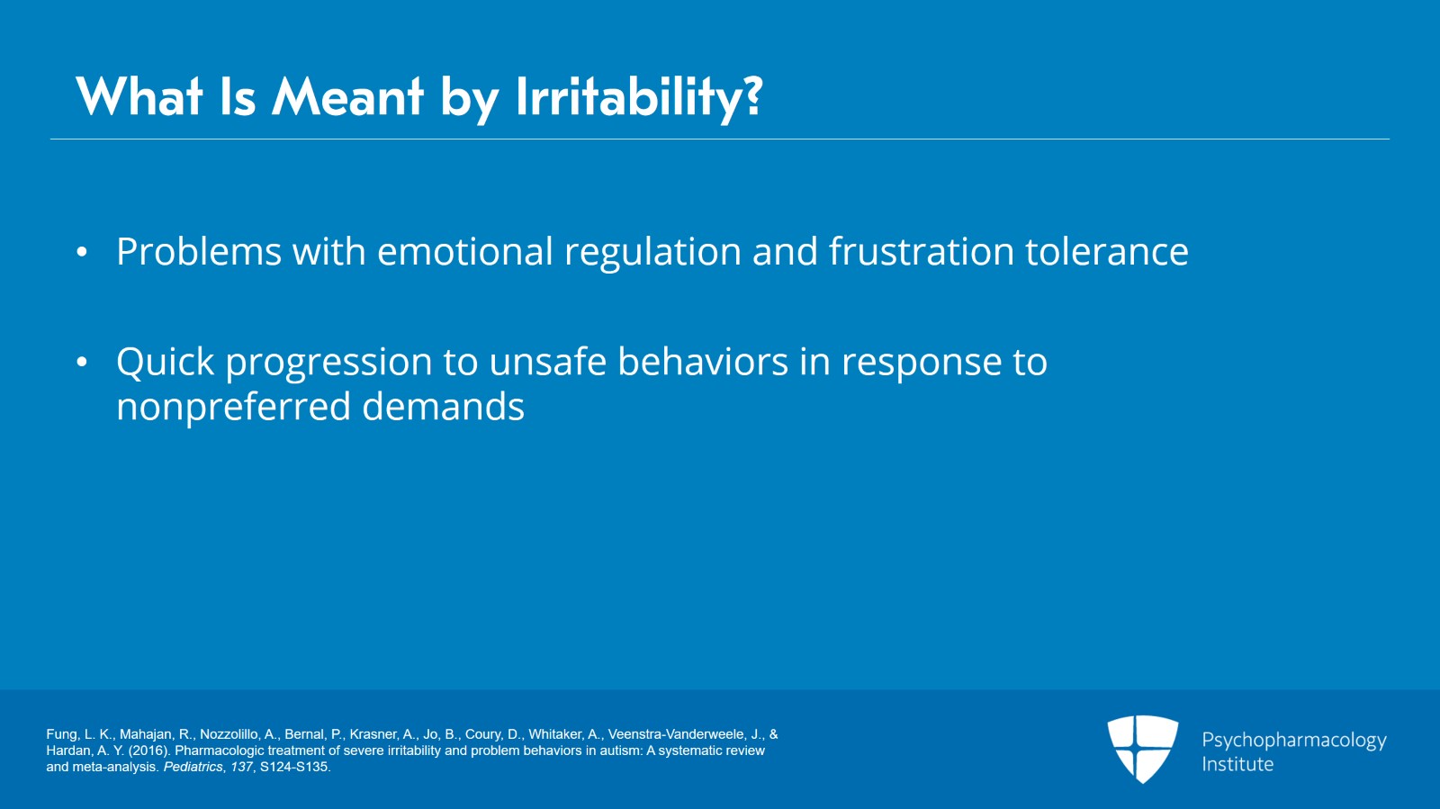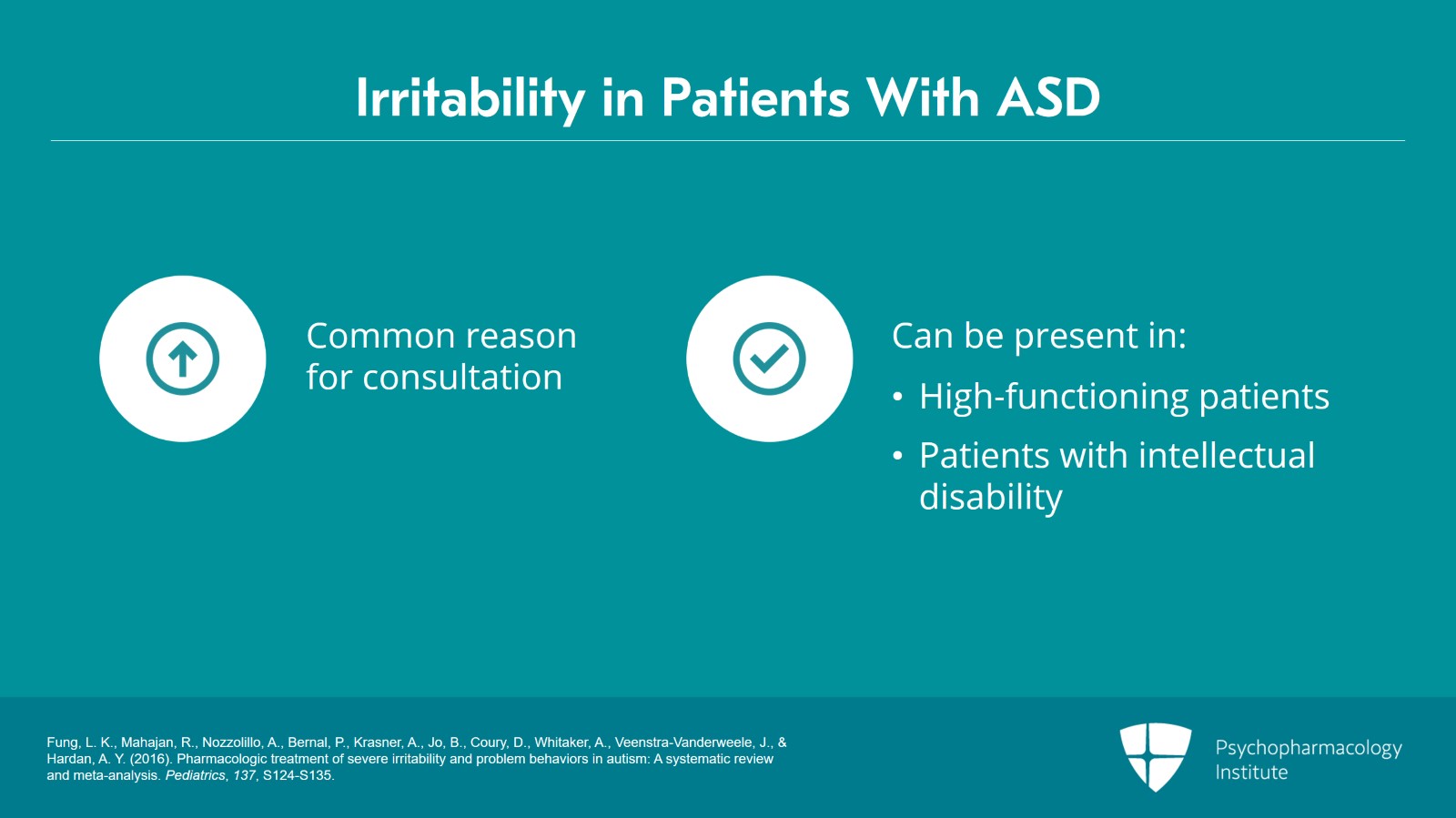 - Fung, L. K., Mahajan, R., Nozzolillo, A., Bernal, P., Krasner, A., Jo, B., Coury, D., Whitaker, A., Veenstra-Vanderweele, J., & Hardan, A. Y. (2016). Pharmacologic treatment of severe irritability and problem behaviors in autism: A systematic review and meta-analysis. Pediatrics, 137, S124-S135.